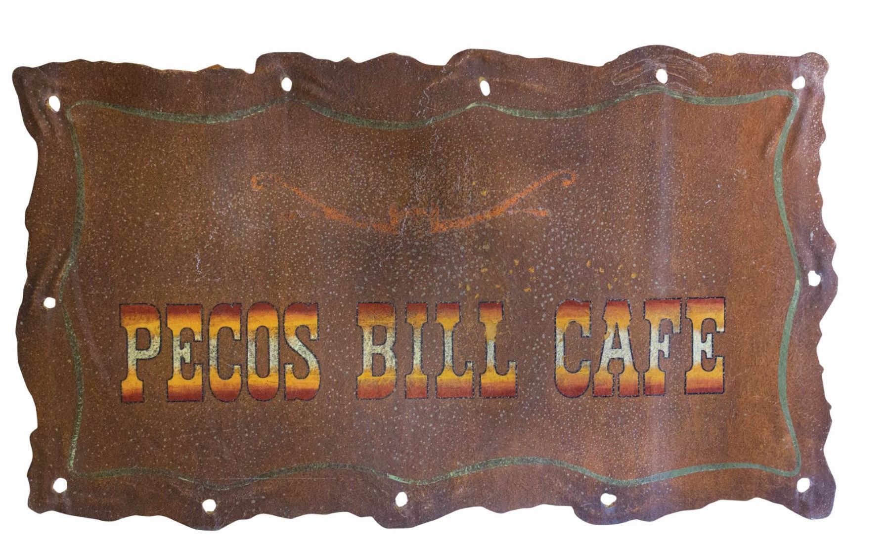 (Walt Disney World, c.1970s-80s) A large sign from the Pecos Bill Cafe in Frontierland. This opening year Magic Kingdom restaurant was a popular barbecue location for over 20 years before it closed and was eventually remodeled as the Pecos Bill Tall Tale Inn & Cafe in 1998. This original sign is from the original iteration of the restaurant, and is painted on board with a textured leather look. Measuring an impressive 36"x61.5", the sign is in good condition overall with some surface and edge wear from the sign's use and removal.