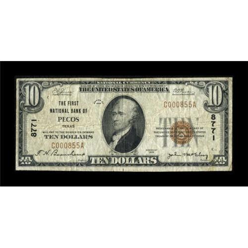 <B>Pecos, TX</B></I> - $10 1929 Ty. 1 <B>The First NB</B></I> Ch. # 8771<BR> This is an evenly circulated example that is tough to come by. <B>Fine.</B></I><BR><BR><b>Shipping:</b> Coins & Currency (<a target="_blank" href="http://www.heritageauctions.com/common/shipping.php">view shipping information</a>)