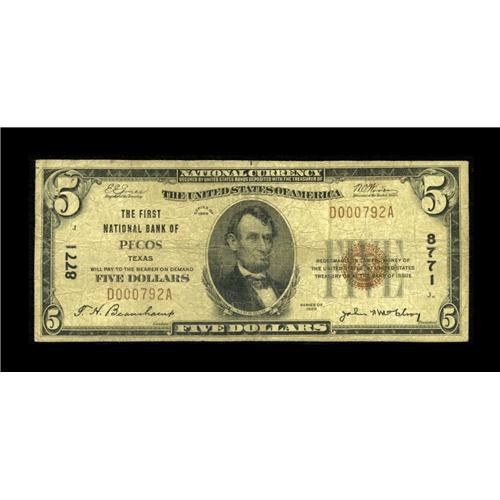 <B>Pecos, TX</B></I> - $5 1929 Ty. 1 <B>The First NB</B></I> Ch. # 8771<BR>This is one of eleven small recorded in the census, but there are just two $5s. <B>Very Good.</B></I><BR><BR><b>Shipping:</b> Coin/Currency (<a target="_blank" href="http://www.heritageauctions.com/common/shipping.php">view shipping information</a>)