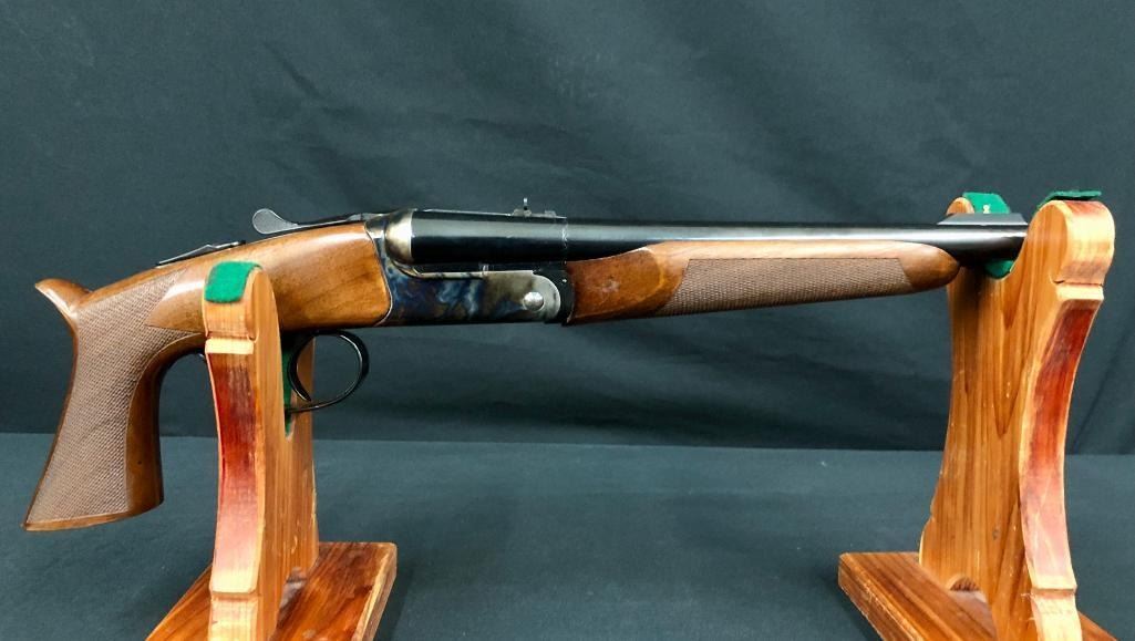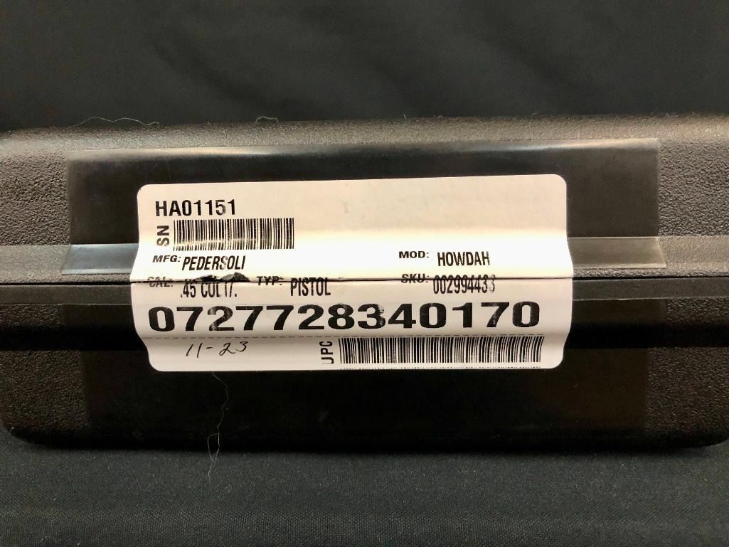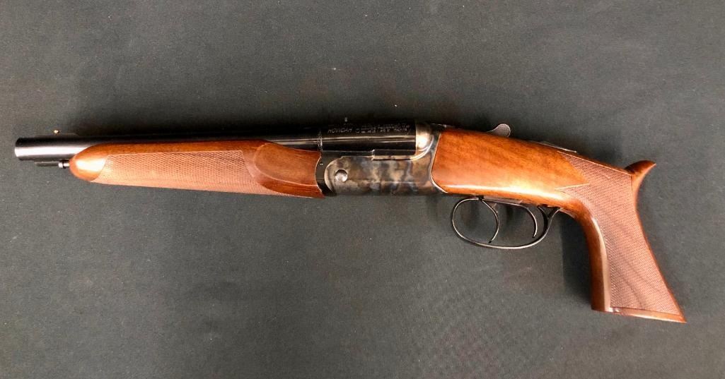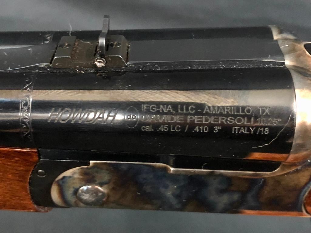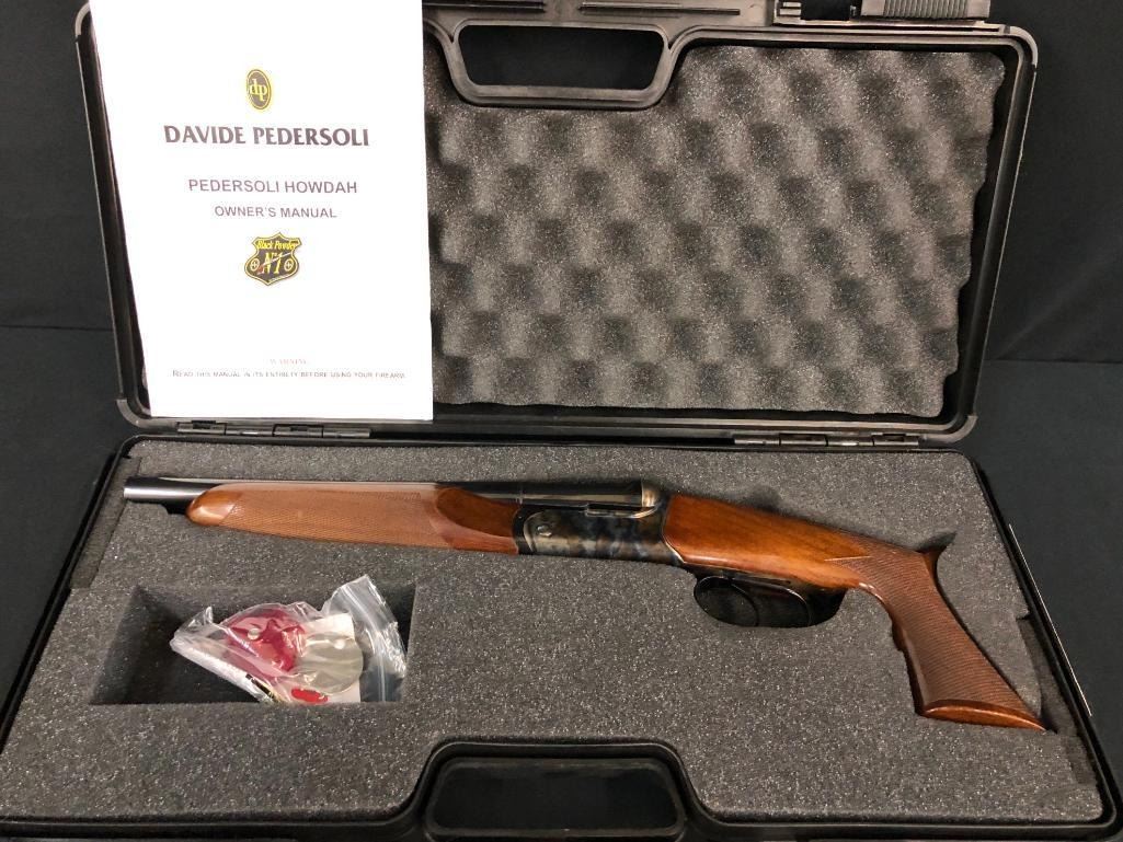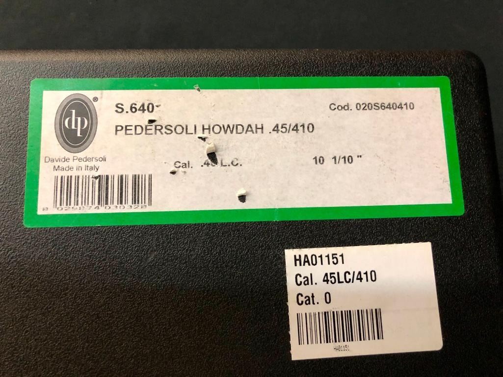 Offered here is an excellent Pedersoli "Howdah" .45 Colt / 410 shotgun, double barrel pistol. The design is based on the 10-inch barrel length Flues Model of the break-open, double barrel pistol introduced by Ithaca in 1922 and manufactured through 1925. An important difference is the Pedersoli has rifled barrels and is chambered for 3-inch .45 Colt or .410 shotgun shells. The grip shape is nearly identical to the early Ithaca models, including the integrated spur to stabilize the gun in the hand during recoil, a design seen on many European Howdah pistols. This one has never been used and comes with its original case and paperwork. MAKER: Pedersoli. Serial No. HA01151. APPROX AGE: Modern. SIZE: Barrel measures 10 inches. CONDITION: Good, minimal wear expected. Please look closely at the pictures as they are an important part of our description and are hereby incorporated into the description, specifically with regards to condition. SHIPPING: There will be a $25 handling / packaging fee for shipping this lot. The actual cost of postage will be added on top of that. BUY IT NOW: If you would like to buy this item now, without waiting for the auction day to bid on it, we do offer this option (which is available up to 48 hours before the actual auction starts). The “Buy it Now†price is the high estimate of this lot (plus applicable fees and the Buyer's premium is discounted to 10% when using the Buy it Now option). If you would like to exercise this option, you must contact us by email (or phone as long as you talk to someone live). Reference this lot number and your intention to "Buy it Now." *****This firearm requires an FFL Transfer*****
