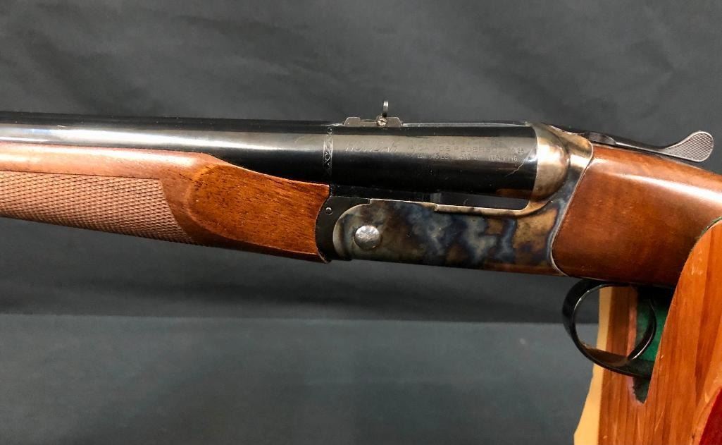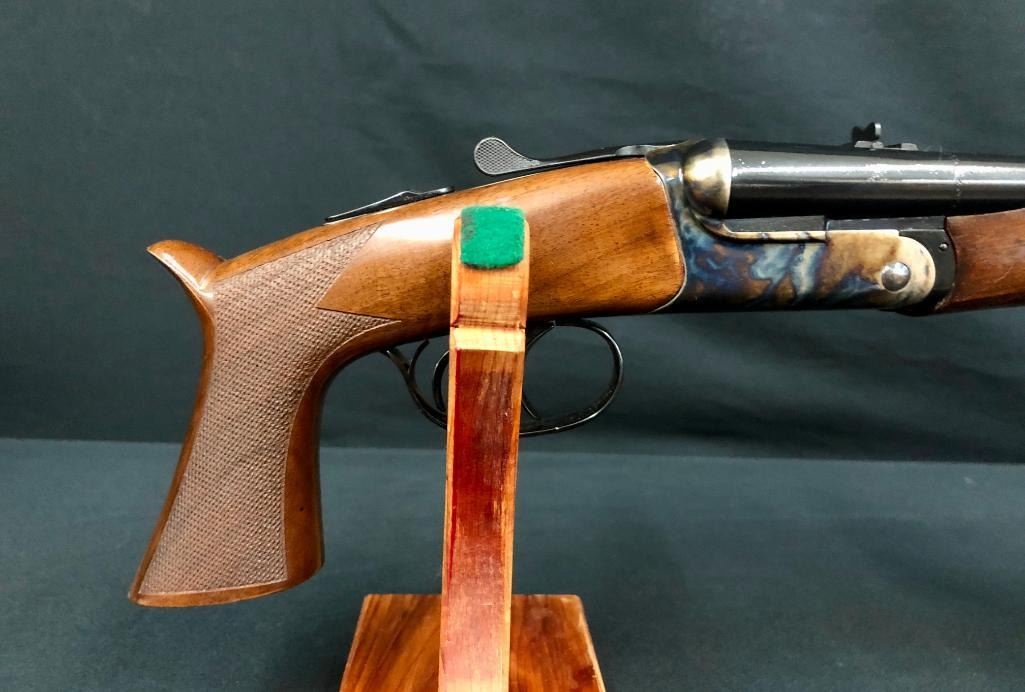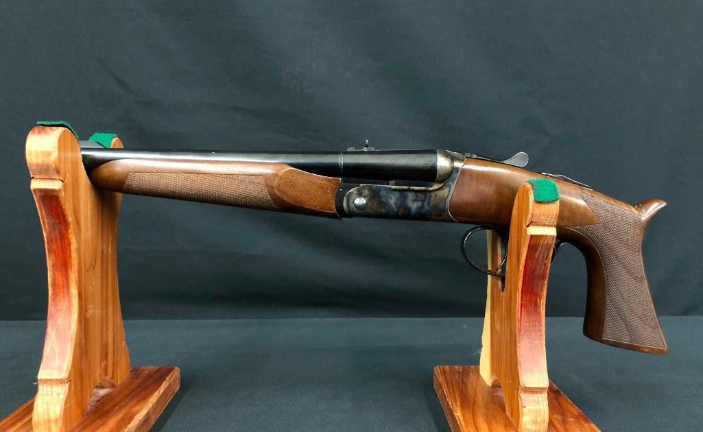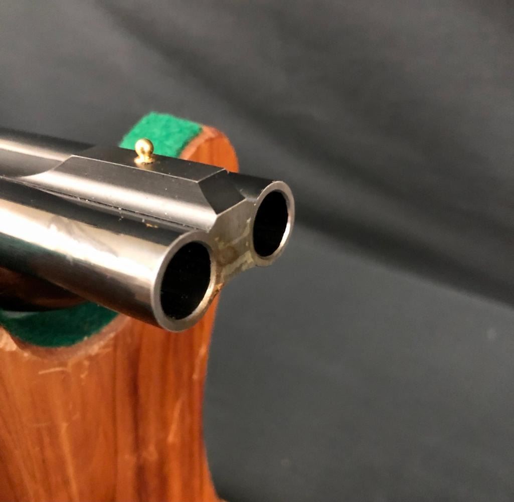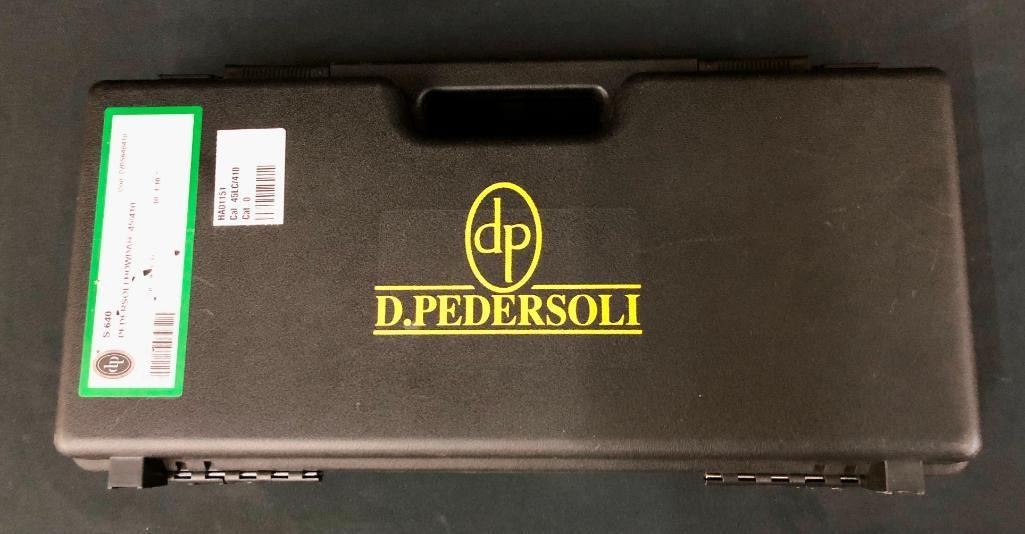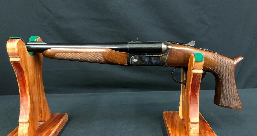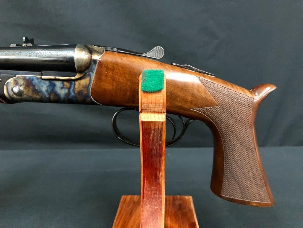 Offered here is an excellent Pedersoli "Howdah" .45 Colt / 410 shotgun, double barrel pistol. The design is based on the 10-inch barrel length Flues Model of the break-open, double barrel pistol introduced by Ithaca in 1922 and manufactured through 1925. An important difference is the Pedersoli has rifled barrels and is chambered for 3-inch .45 Colt or .410 shotgun shells. The grip shape is nearly identical to the early Ithaca models, including the integrated spur to stabilize the gun in the hand during recoil, a design seen on many European Howdah pistols. This one has never been used and comes with its original case and paperwork. MAKER: Pedersoli. Serial No. HA01151. APPROX AGE: Modern. SIZE: Barrel measures 10 inches. CONDITION: Good, minimal wear expected. Please look closely at the pictures as they are an important part of our description and are hereby incorporated into the description, specifically with regards to condition. SHIPPING: There will be a $25 handling / packaging fee for shipping this lot. The actual cost of postage will be added on top of that. BUY IT NOW: If you would like to buy this item now, without waiting for the auction day to bid on it, we do offer this option (which is available up to 48 hours before the actual auction starts). The “Buy it Now†price is the high estimate of this lot (plus applicable fees and the Buyer's premium is discounted to 10% when using the Buy it Now option). If you would like to exercise this option, you must contact us by email (or phone as long as you talk to someone live). Reference this lot number and your intention to "Buy it Now." *****This firearm requires an FFL Transfer*****