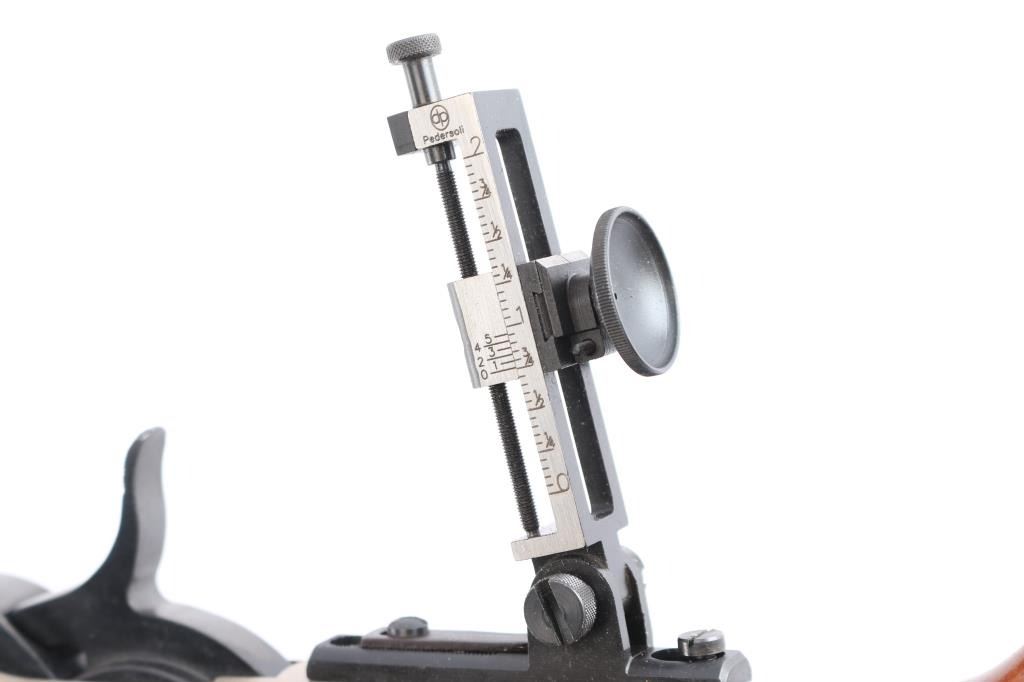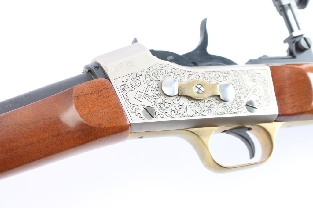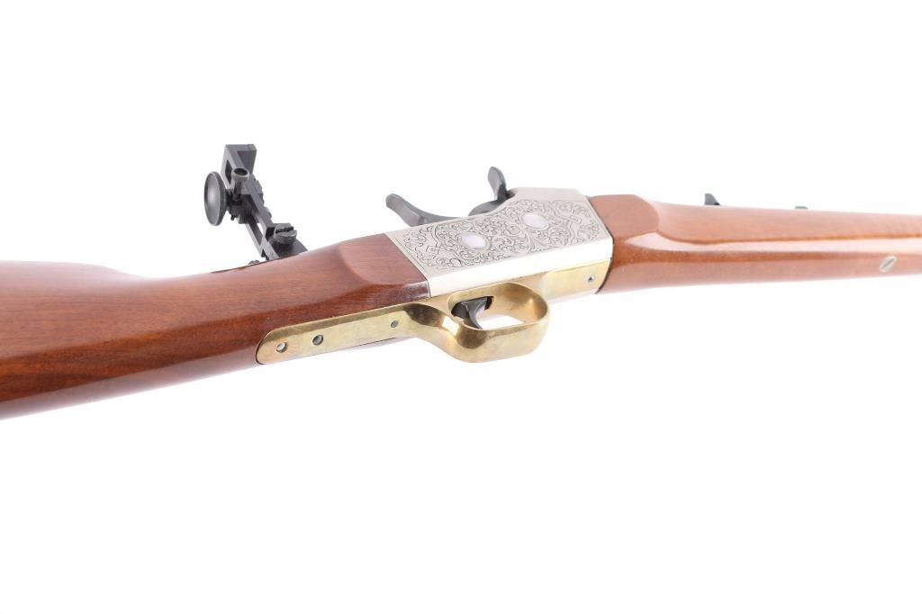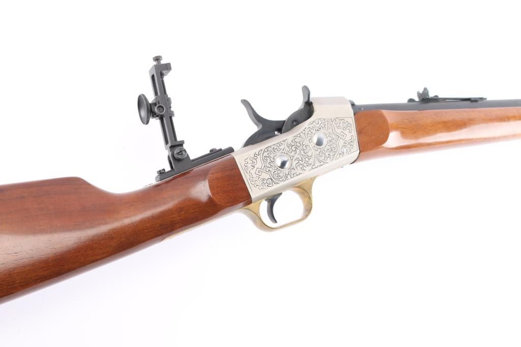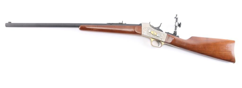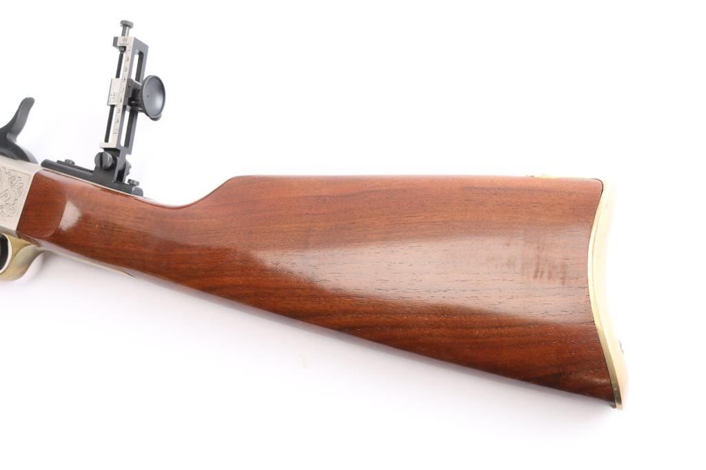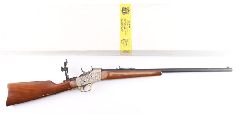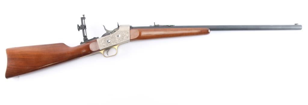 SN: RO14484. The "Mississippi Classic". Made in Italy by Pedersoli for Italian Firearms Group, Amarillo, Texas. Features a matte blued 26" round barrel, high polish blued block & trigger, coin finished receiver with floral/scroll engraving , brass triggerguard & butt plate. blade, brass bead front sight, semi-buckhorn rear sporting sight in dovetails, folding adjustable factory peep sight in installed on the tang with a Hadley Eyedisc. It has very nice smooth wood stocks. Rolling block action is smooth, bore is pristine, wood and metal finishes are excellent. Rifle is in like new condition. Comes in factory box with matching label, manual & CD. manufacture 2016.