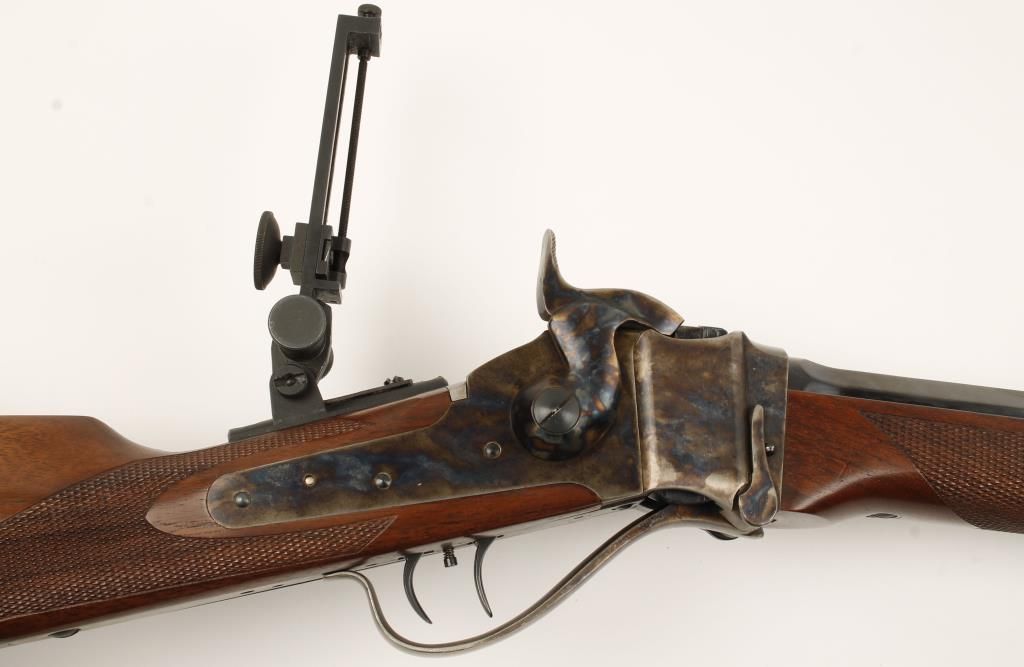 High quality Italian made replica of the famous 1874 Sharps sporting rifle with 32" octagon barrel. Case colored receiver and butt plate, blued barrel, checkered straight grip walnut stock and forend, double set trigger, tunnel front sight, flip up graduated rear sight with Creedmore flip up tang sight installed. Very good bore and action. Condition: Excellent showing very little use. *Modern Firearm*