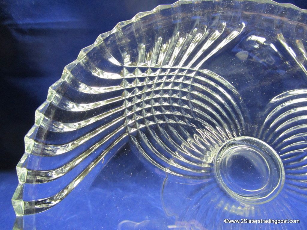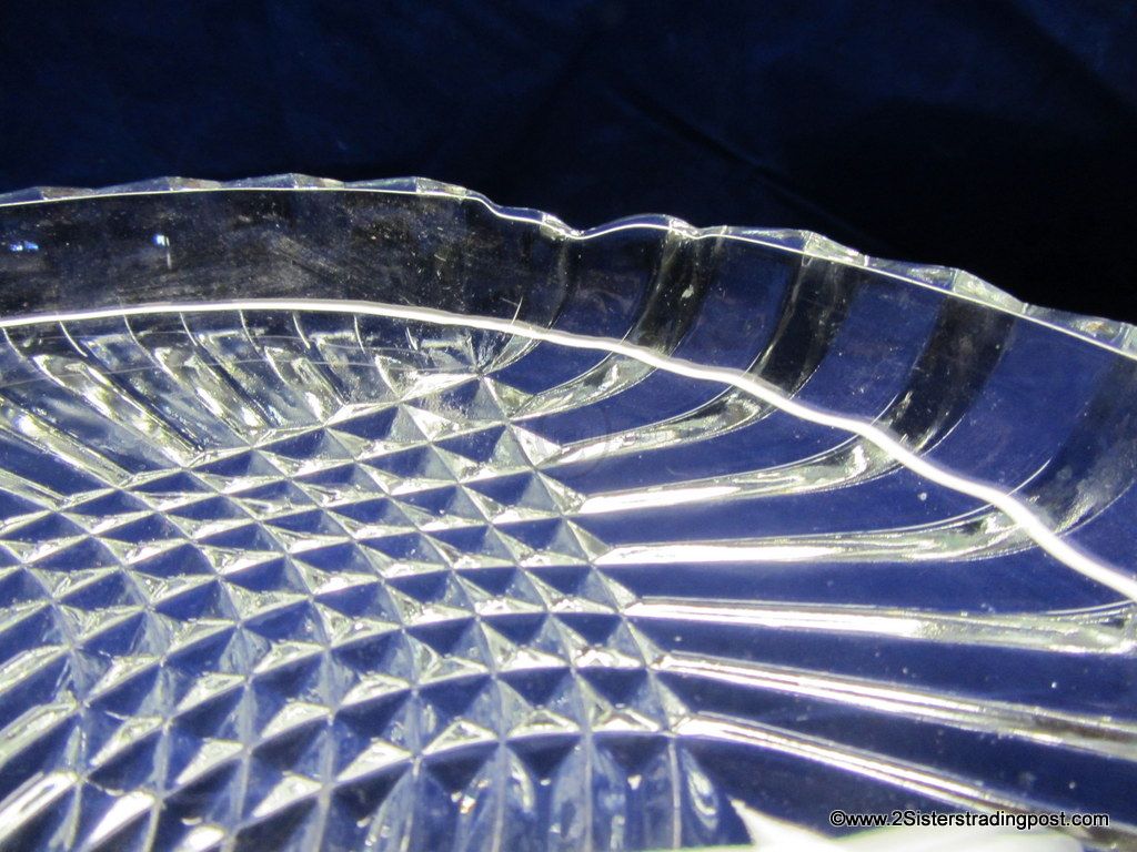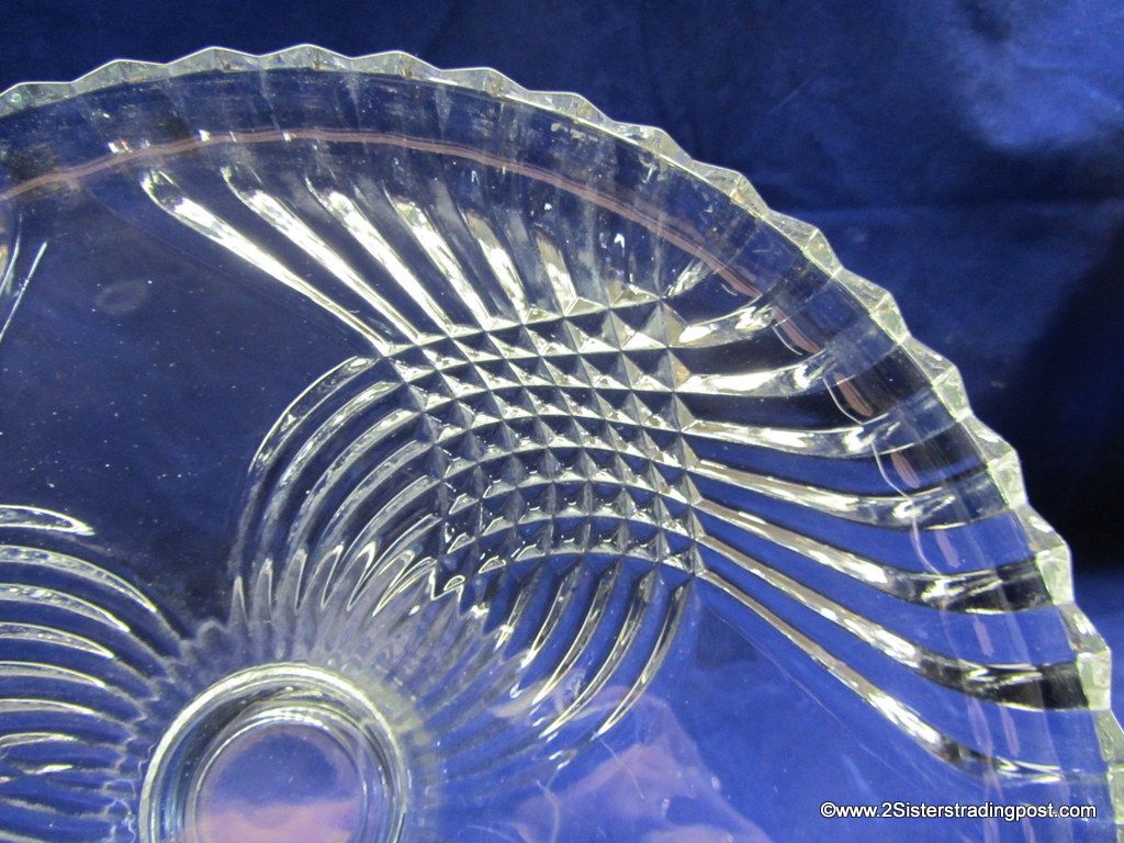 4.5" across so this plate will not tip over easily. The plate itself has a beautiful swirl design that forms a trio pattern on the plate and as the swirls cross the flow to the edge forming points around the plate. All points are good, with no chips or nicks. NOTE: there is a manufactures defect on the edge of the plate, when the glass was slumped it did not hold its crisp edge one place (see images for details)