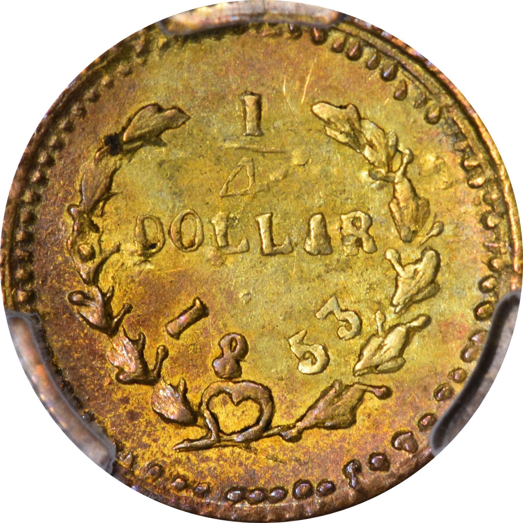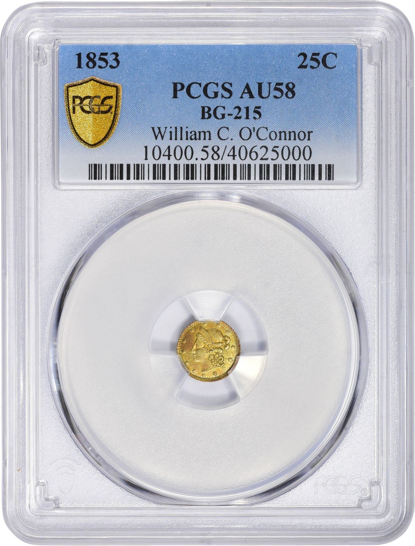Description: 1853 round ¼ Dollar, BG-215, Die State II (reverse reground, only 12 berries visible). PCGS AU58. Low Rarity 7. Same obverse; similar reverse, but 8 touches bow. Also by Frontier & Deviercy. 12 recorded examples, one of which is holed; 10 in Pop Report. Slightest evidence of wear, very light toning. PCGS AU58 William C. O’Connor Collection (PCGS# 10400). PCGS POP 4 + 6.