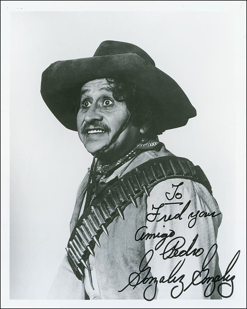 Glossy 8 x 10 photo of Gonzalez in western gear, signed and inscribed in black felt tip, “To Fred, Your Amigo, Pedro Gonzalez Gonzalez.” In fine condition, with a few staple marks to the top left corner.