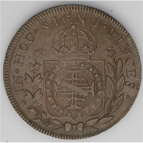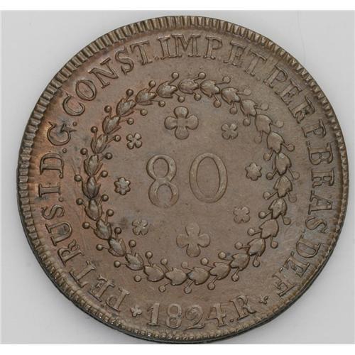 <B>Pedro I 80 Reis 1824-R, </B></I>KM366.1, choice milk chocolate brown UNC with satiny surfaces and hints of luster in the obverse legends. A large copper coin with great eye appeal!
