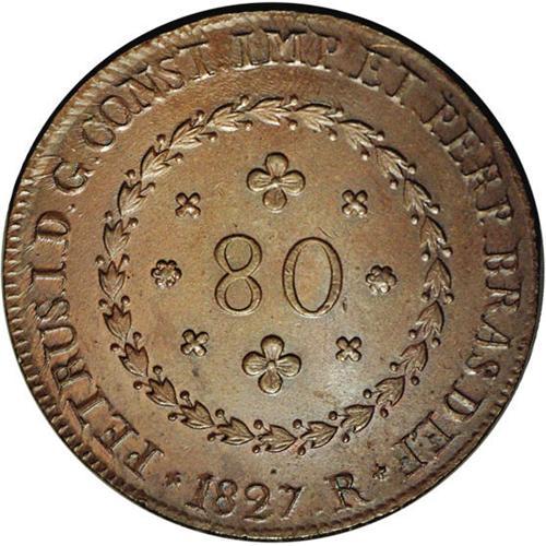 Pedro I 80 Reis 1827-R, KM366.1, superb brown UNC with Pedro I 80 Reis 1827-R,