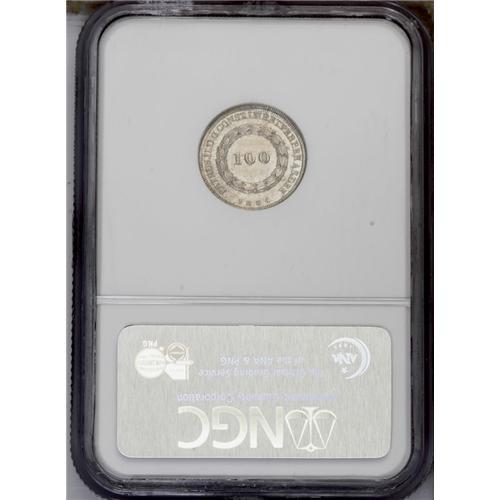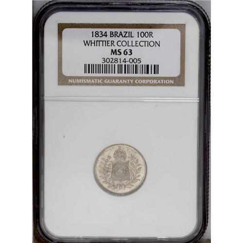 <B>Pedro II 100 Reis 1834, </B></I>KM452, MS63 NGC, subtle toning over fully lustrous surfaces, a very attractive example and rare in this designation.