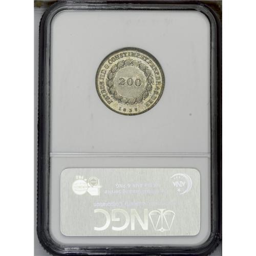 <B>Pedro II 200 Reis 1837, </B></I>KM455, AU58 NGC, lightly toned with considerable underlying luster.
