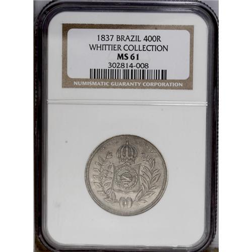 <B>Pedro II 400 Reis 1837, </B></I>KM453, MS61 NGC, lightly toned, very elusive type in Mint State.