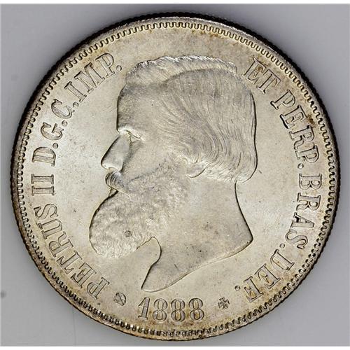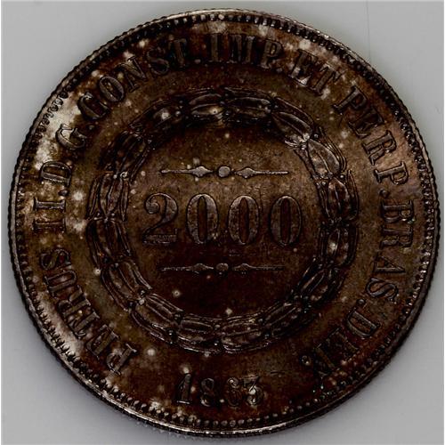<B>Pedro II Trio of 2000 Reis, </B></I>KM466 1853, choice AU-UNC, deep charcoal gray patina, one edge ding on the reverse at the top and 1863, AU-UNC, toned obverse and fully lustrous reverse, and KM485 1888, brilliant UNC with very subtle golden toning, a premium example of this portrait type.