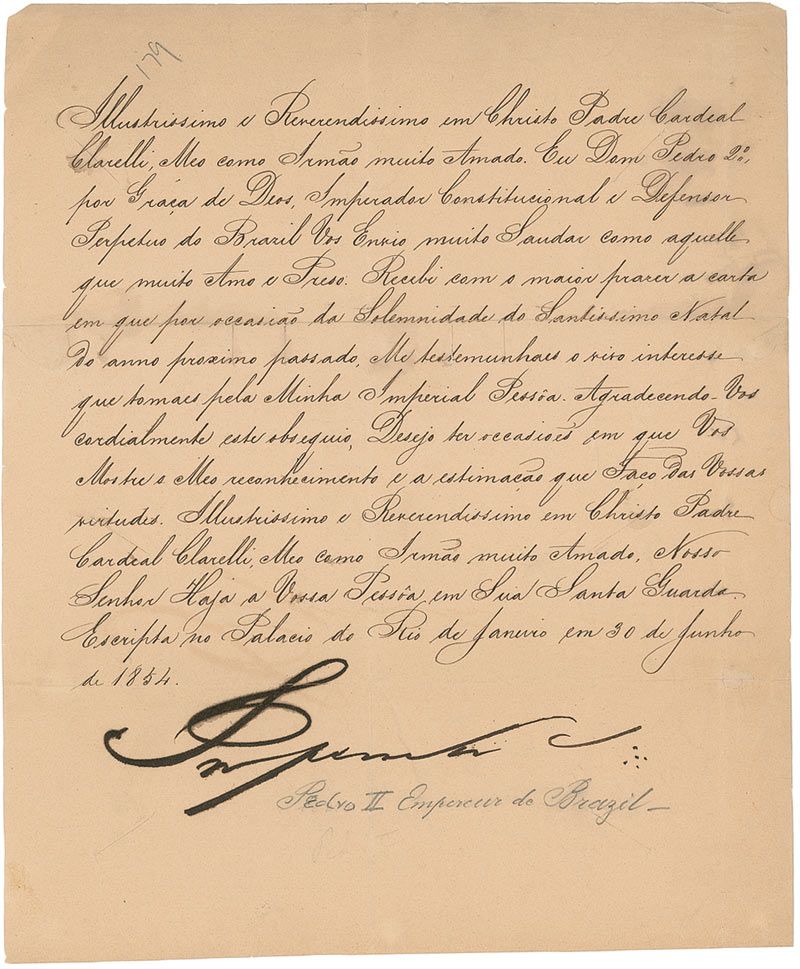 Emperor of Brazil who died in 1891. LS in Spanish, signed “Imperador,” one page, 8.5 x 10.25, June 31, 1854. Untranslated letter boldly signed at the conclusion as Emperor. Reinforcement on reverse of horizontal folds, scattered small cuts to page, some slight ink erosion to signature, uniform toning, and several pencil notations, including some below signature, otherwise very good condition.