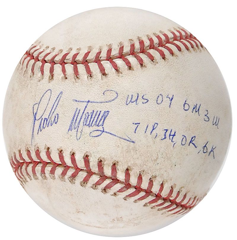 Official Rawlings game-used 2004 World Series baseball from Game 3 between the Red Sox and St. Louis Cardinals, signed in blue ballpoint on the sweet spot by Martinez who pitched the game, adding his stats from his performance, “Pedro Martinez, WAS 04, Gm 3, 7IP, 3H, 0R, 6K.” In fine condition, with expected wear and soiling from use and a Major League Baseball hologram affixed to ball, number MR-261836.