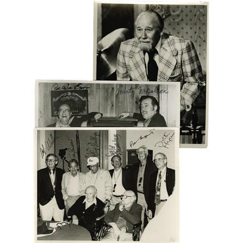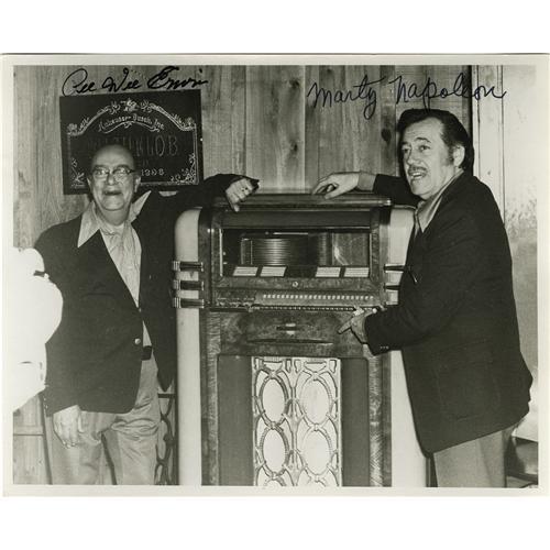 <B>Pee Wee Erwin, Marty Napoleon, Bob Wilber, Joe Bushkin, Flip Phillips, Dave Frishberg, Bob Haggart and Dick Hyman, Autographed Al White "Jazz Party" Silver Prints, Group of 3 (1975-1995).</B></I> <BR>George "Pee Wee" Erwin (trumpet) and Marty Napoleon (piano, page 158) -- Pee Wee Erwin and Marty Napoleon find a few of their tunes on this jukebox during a 1978 road trip. <BR>Kenneth "Red" Norvo (vibes, page 160) -- Red Norvo called his large felt-covered mallets "Idahos on a stick." <BR>Bob Wilber (clarinet), Joe Bushkin (piano), Joseph "Flip" Phillips (tenor sax), Dave Frishberg (piano), Bob Haggart (bass), Dick Hyman (piano), and Kenneth "Red" Norvo (vibes, page 161) -- The giants of jazz celebrate their March birthdays at the 1996 "March of Jazz" party in Clearwater. The whole back row had March birthdays! <BR>Each 8" x 10" silver print is in Excellent condition. <I>From the Al White Jazz autograph archive.</B></I>