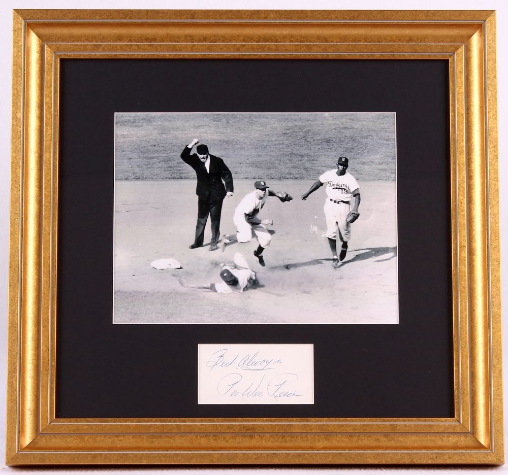 Custom framed display measures 16" x 17" in size. Features a 2" x 4" cut that has been hand-signed and inscribed in blue ink pen by Pee Wee Reese (D 1999, Dodgers HOF). The autograph includes an official PSA/DNA hologram and matching COA for authenticity purposes.