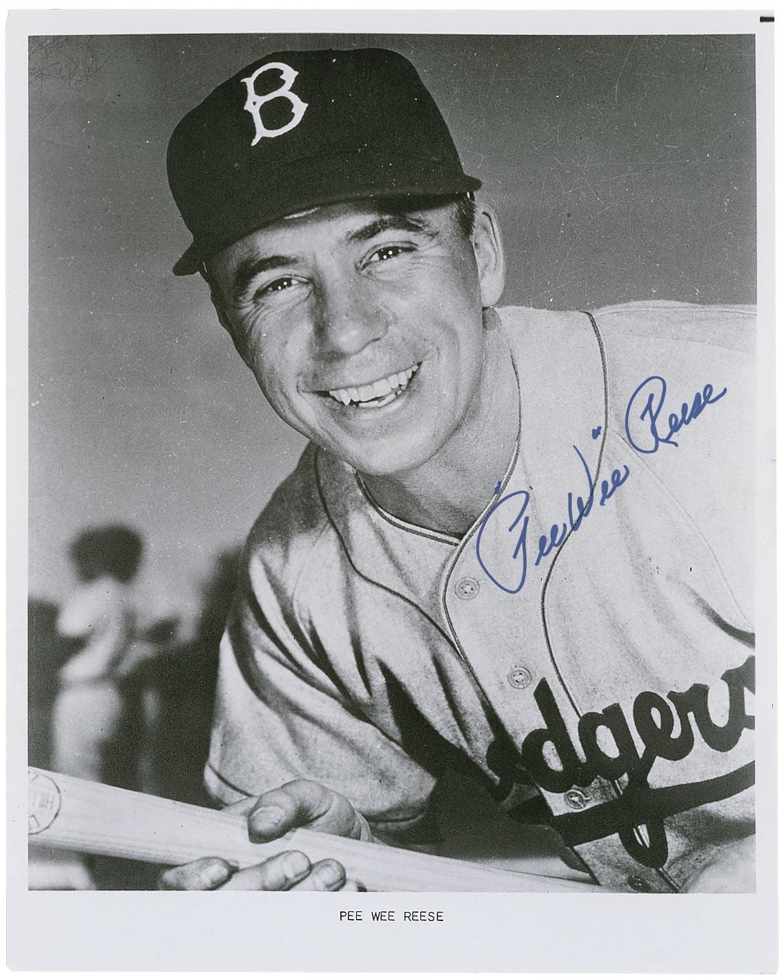 Glossy 8 x 10 photo of Reese in his Brooklyn Dodgers uniform, signed in blue felt tip “’Pee Wee’ Reese.” In fine condition with a couple of tiny bends and scattered flaws inherent to the negative.
