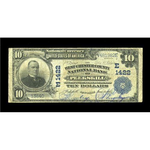 <B>Peekskill, NY</B></I> - $10 1902 Plain Back Fr. 624 <B>The Westchester County NB </B></I> Ch. # (E)1422<BR>Bold blue signatures are still present on this large size note from Westchester County. <B>Fine</B></I>.