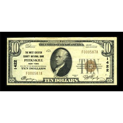 <B>Peekskill, NY</B></I> - $10 1929 Ty. 1 <B>The West Chester County NB</B></I> Ch. # 1422<BR> A rather common bank in large size, but very scarce in small, with only a dozen such notes recorded in the census. This is one of the nicer ones known. <B>Very Fine+,</B></I> with the paper just a bit toned. <BR><BR><b>Shipping:</b> Coins & Currency (<a target="_blank" href="http://www.heritageauctions.com/common/shipping.php">view shipping information</a>)