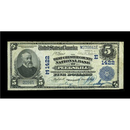 <B>Peekskill, NY</B></I> - $5 1902 Plain Back Fr. 598 <B>The Westchester County NB</B></I> Ch. # (E)1422<BR>This evenly circulated large example traces its pedigree back to the September 1980 NASCA sale of George Decker's New York large size collection, where it was lot 1887. <B>Fine,</B></I> with rubber stamped signatures of two members of the Puglsley clan, the long time owners of this institution.<BR><BR><b>Shipping:</b> Coin/Currency (<a target="_blank" href="http://www.heritageauctions.com/common/shipping.php">view shipping information</a>)