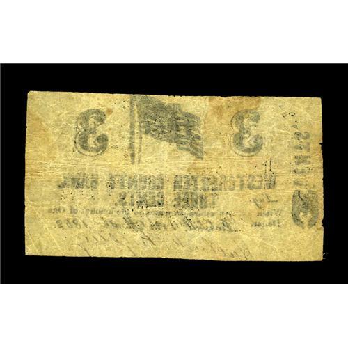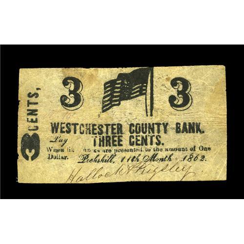 <B>Peekskill, NY- Hallock & Pugsley</B></I> 3¢ Nov. 1862 Harris UNL<BR>This crude note was likely the first scrip emission from this issuer. The design is unlisted in Harris, and we've yet to see another. <B>Fine-Very Fine.</B></I>