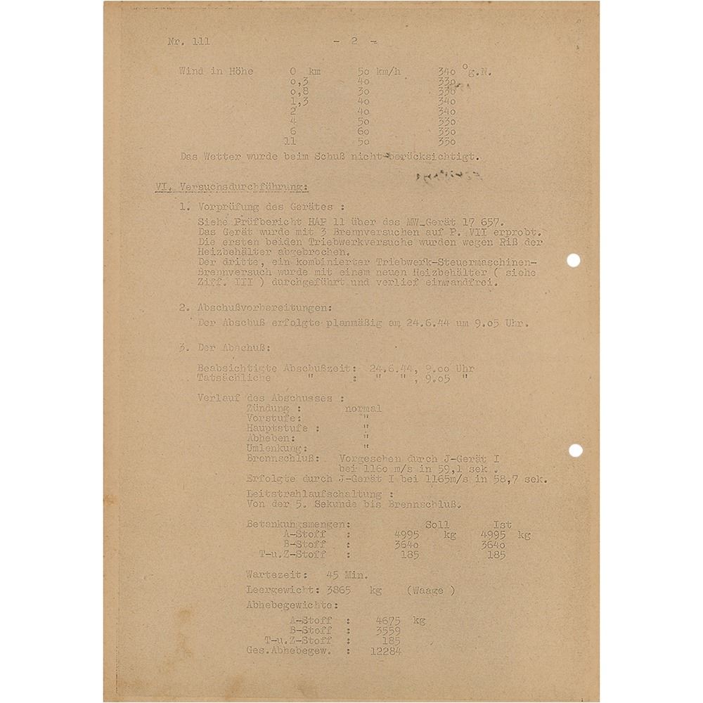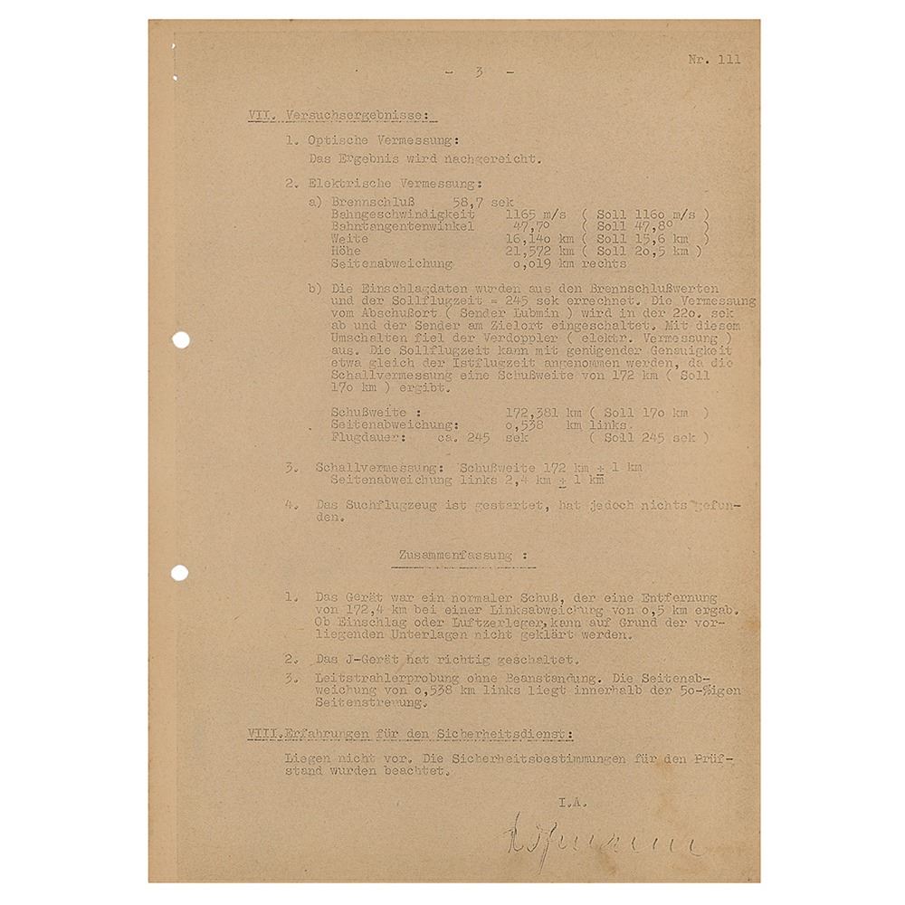 Original copy of a German document, three pages on two sheets, 8.25 x 11.75, July 3, 1944. Launch report of a German V-2 (A4) rocket, stamped as top secret ("Geheime Kommandosache"), issued at Heimat Artillerie Park 11 at the PeenemÌ_nde Army Research Center. The report offers details of the rocket and launch: "Machine nr. 17657, Constructor MW [Mittelwerke], Launch date and time: 24.6.1944, 9.05AM, Responsible people/engineers : BrÌ_tzel and Huzel. Launch site: Karlshagen, launch site VII." This is followed by the test goal ("Test of an inner circuit, guidance beam, target shot at 170km distance"), weather report, and technical data. Most interesting is the result of the test flight: the rocket crashed after traveling 172km, only 538 meters off-target. In fine condition, with uniform toning.