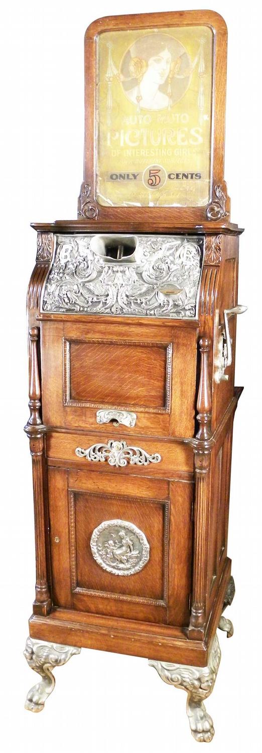Peep Show by Caille Bros. Detroit. High relief castings, original marquee. Full of risqué nude cards. Comes with key for cash door not for bottom. All original excellent condition. 21 X 56 X 19 inches.