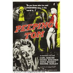 <B>Peeping Tom (Anglo Amalgamated, 1960)</B></I> British One Sheet (27" X 40"). Michael Powell's film about violence and voyeurism still remains extremely controversial, some claim it to be sick and perverse while others claim it to be a masterpiece. The British press had long been hostile to Powell's unorthodox films and when "Peeping Tom" was released they crucified him in the press, essentially destroying his career. Today, many critics view the film as a profound accomplishment and rank it right alongside Alfred Hitchcock's best psychological thrillers. There are corner pinholes and tape stains on the top border. Very Fine.