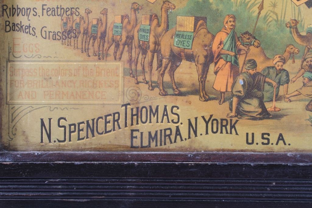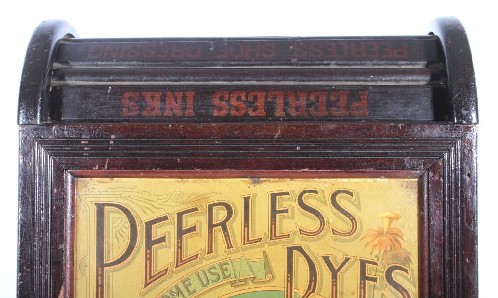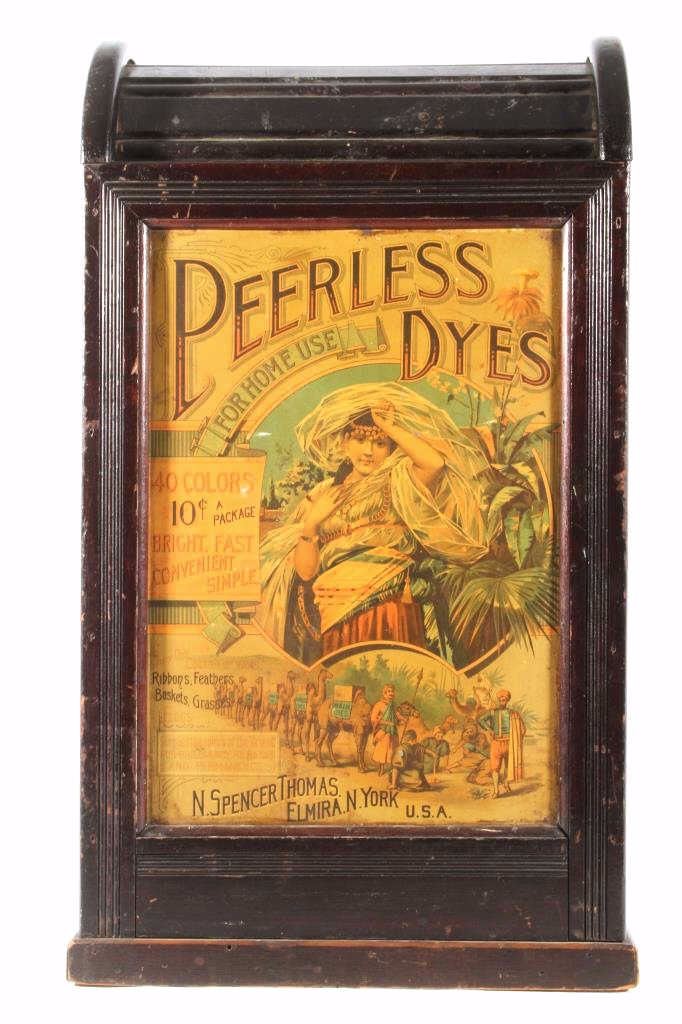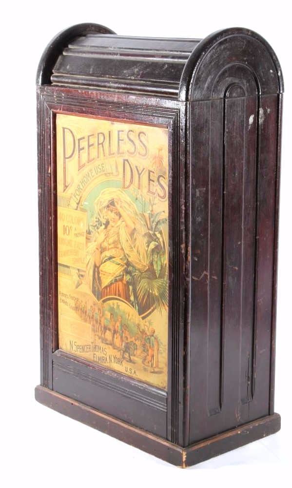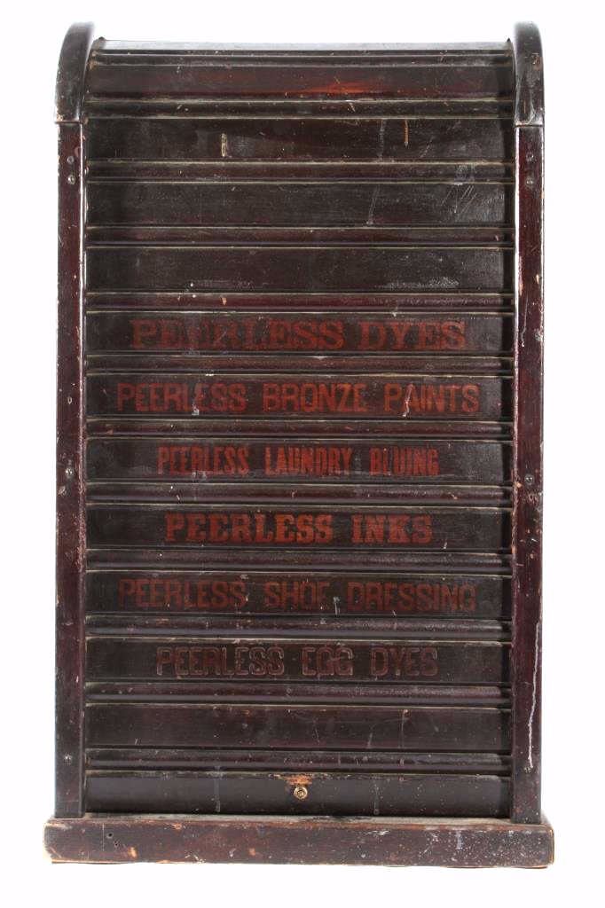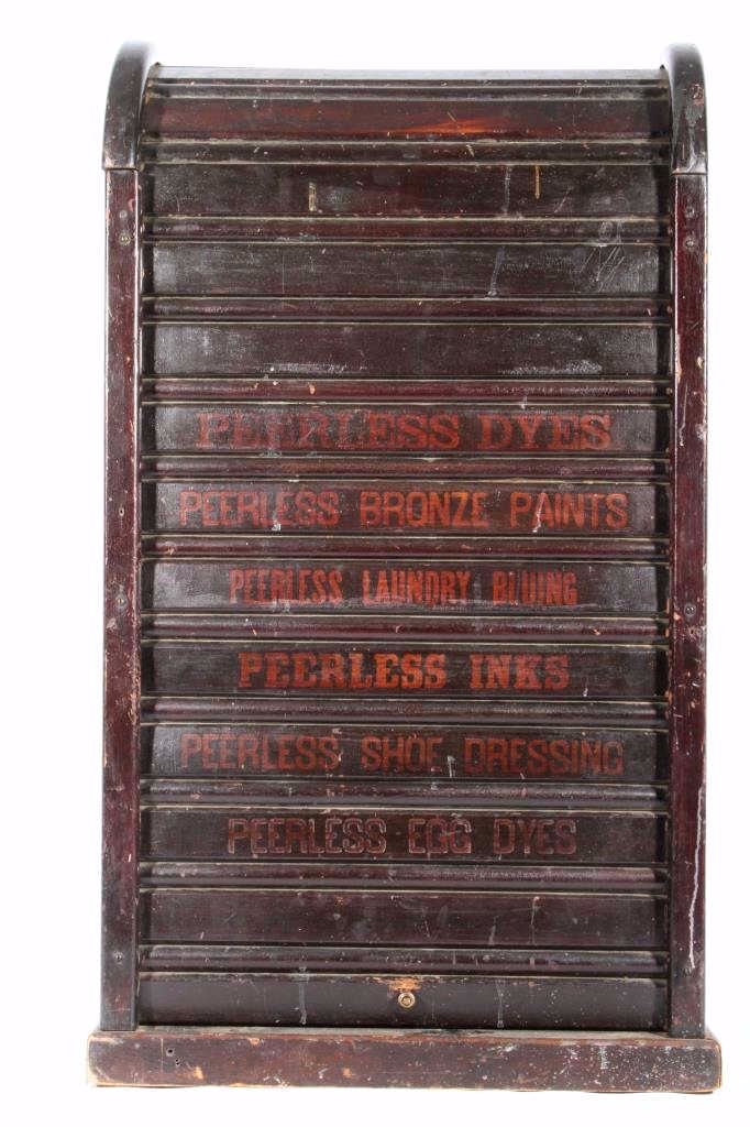 This is an original extremely rare Peerless Dyes Cabinet from N. Spencer Thomas Elmira. N. York U.S.A. The 19th Century piece has the rare tombstone style design with tambour rolling door and extremely rare original Tin Advertising sign in the front. Most every example of the Peerless Dye cabinets by Spencer shows the paper graphics, but this piece has the very good condition for its age original tin. The back of the cabinet shows advertising wording across the wood slats. The cabinet shows some signs of age, but overall is one of the finest Dye cabinets available. Measures 31 7/8"H x 18.75"W x 10 5/8"D. The rolling door is missing a few of the slats.