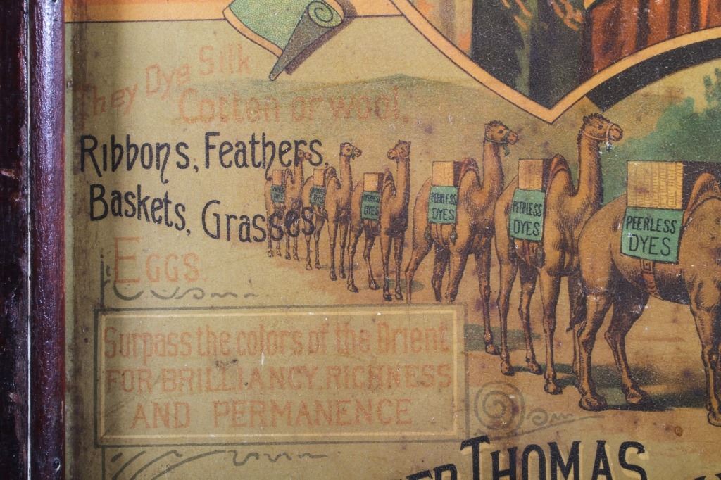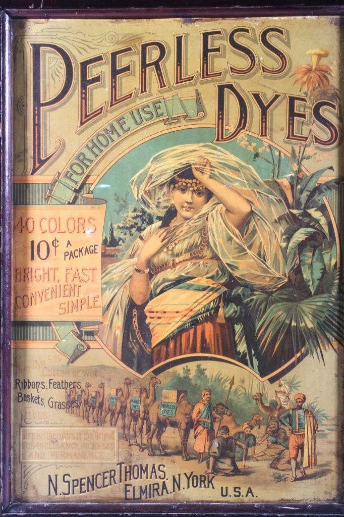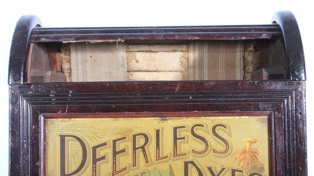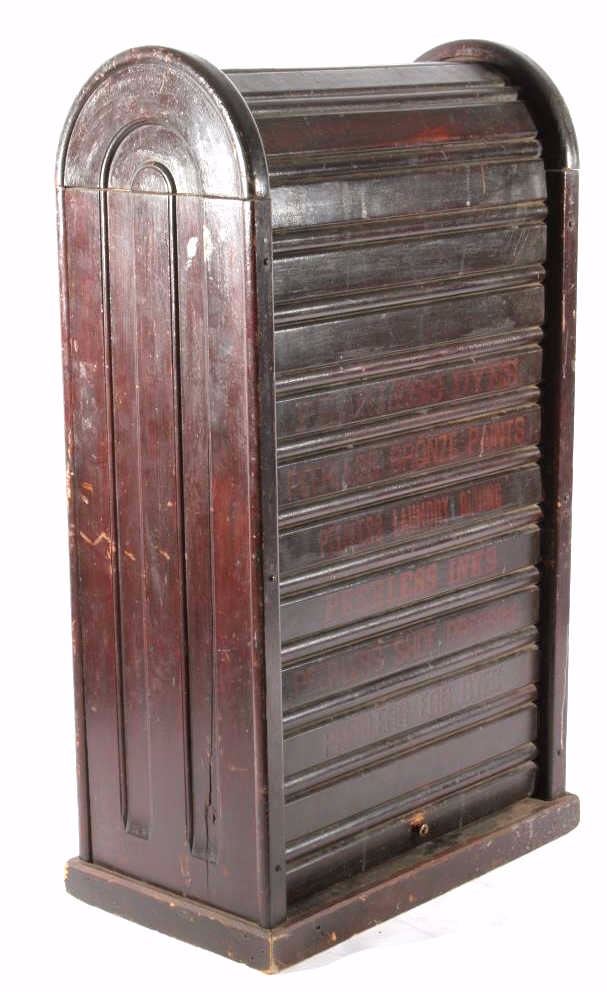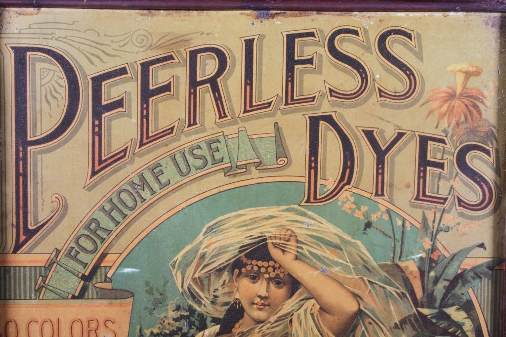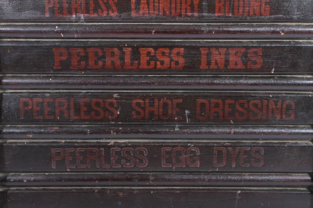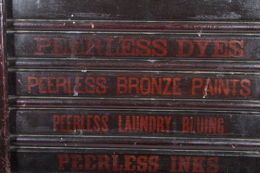 This is an original extremely rare Peerless Dyes Cabinet from N. Spencer Thomas Elmira. N. York U.S.A. The 19th Century piece has the rare tombstone style design with tambour rolling door and extremely rare original Tin Advertising sign in the front. Most every example of the Peerless Dye cabinets by Spencer shows the paper graphics, but this piece has the very good condition for its age original tin. The back of the cabinet shows advertising wording across the wood slats. The cabinet shows some signs of age, but overall is one of the finest Dye cabinets available. Measures 31 7/8"H x 18.75"W x 10 5/8"D. The rolling door is missing a few of the slats.