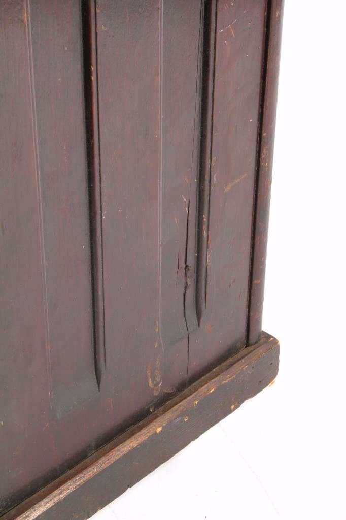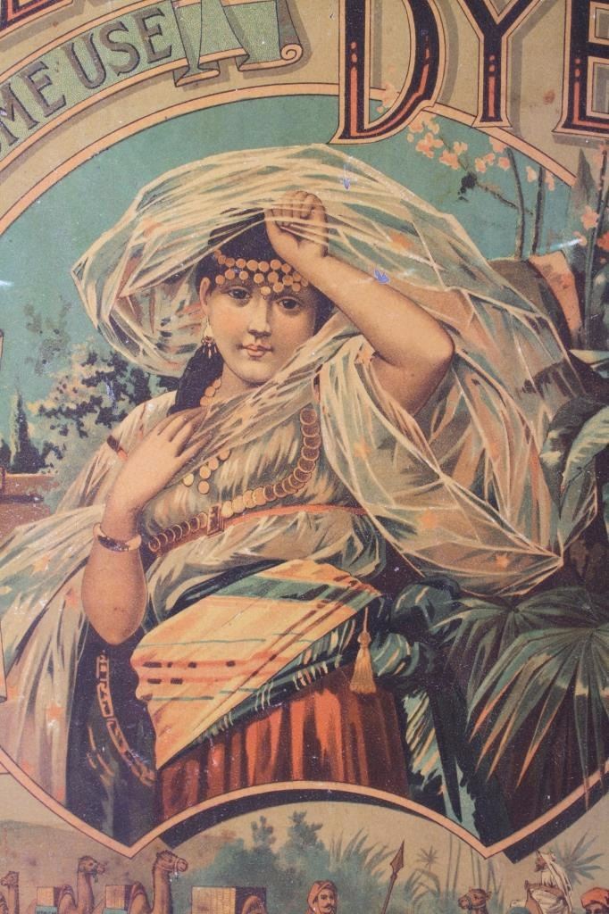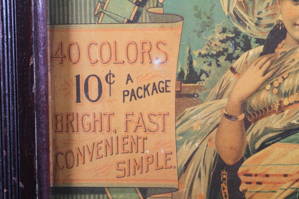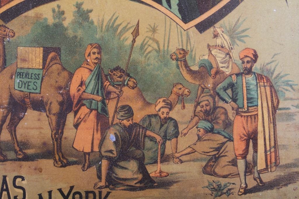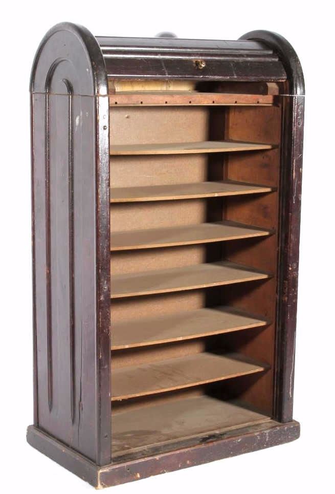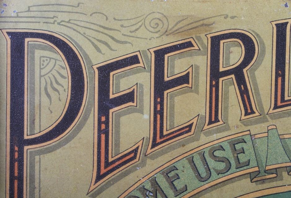 This is an original extremely rare Peerless Dyes Cabinet from N. Spencer Thomas Elmira. N. York U.S.A. The 19th Century piece has the rare tombstone style design with tambour rolling door and extremely rare original Tin Advertising sign in the front. Most every example of the Peerless Dye cabinets by Spencer shows the paper graphics, but this piece has the very good condition for its age original tin. The back of the cabinet shows advertising wording across the wood slats. The cabinet shows some signs of age, but overall is one of the finest Dye cabinets available. Measures 31 7/8"H x 18.75"W x 10 5/8"D. The rolling door is missing a few of the slats.
