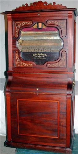 Peerless pre 1920 44 note piano nickelodeon in mahogany cabinet. The general appearance of the cabinet is above average. The machine will play, but not well. Coin-operated.