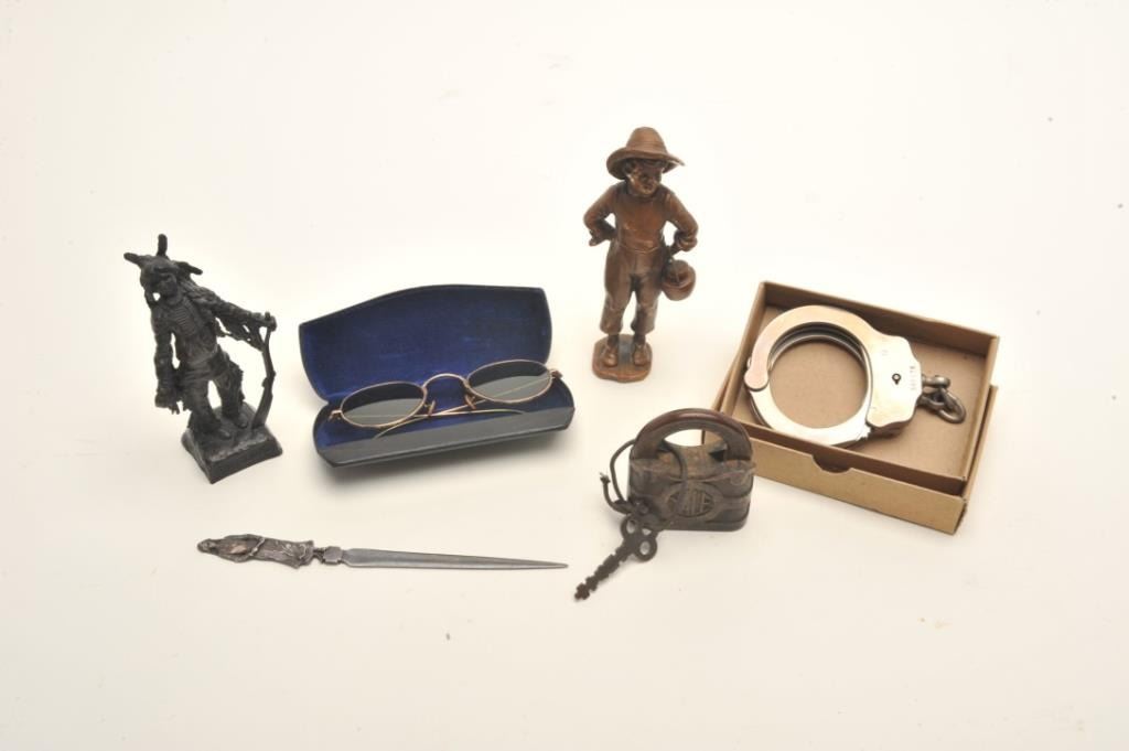 Peerless cuffs, lock, 2 small bronzes and letter opener. Est.: $100-$200