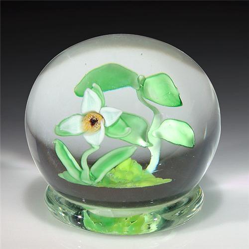 Peet Robison 1979 footed daffodil paperweight. A yellow-centered white daffodil blooms atop a stem, with light green leaves, on one side of the piece, while a stalk of four green leaves stands on the opposite side, over pebbly light green ground. Clear footed base. Signed/dated. Diameter 3". <p>Each winning bidder will receive one copy of "All About Paperweigths" and a paperweight stand for each paperweight won. (One book per winner, one stand per paperweight).