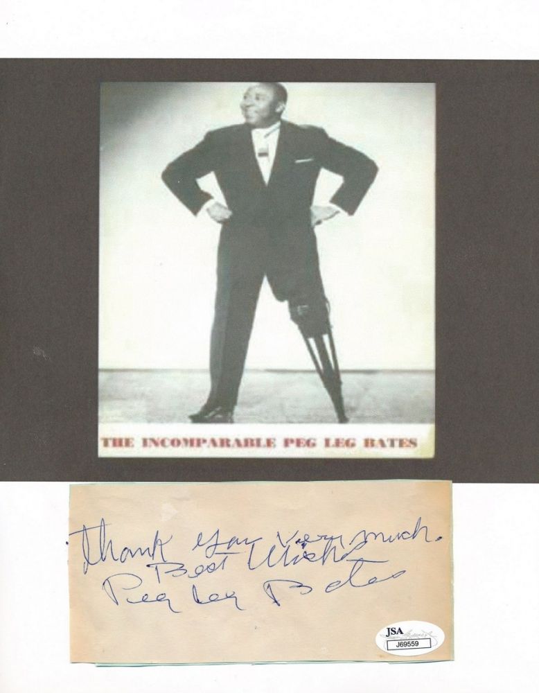 4" x 5" Cut has been glued to a low quality computer print. Cut has been hand-signed in blue ink pen by Peg Leg Bates. The autograph includes an official James Spence Authentication (JSA) hologram and matching COA for authenticity purposes.