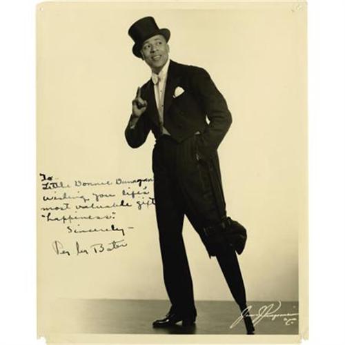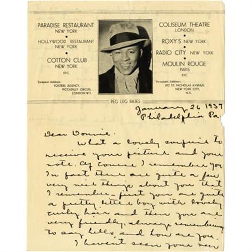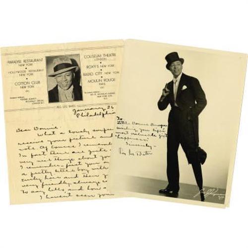 <B>Peg Leg Bates Signed Photo and Letter.</B></I> A dynamic 8" x 10" photo of Peg Leg Bates, in top hat and tuxedo, peg leg in evidence; signed in black fountain ink, "To Little Donnie Dunagan Wishing you life's most valuable gift 'happiness.' Sincerely - Peg Leg Bates." Also a letter on Bates' 8" x 10" professional letterhead (with photo and list of recent engagements), dated January 26, 1939 in Philadelphia, written in black fountain ink and signed in full, which accompanied the picture. Donnie had met Bates during a personal appearance, and had obviously written to him; Bates' return letter is kind and charming, with Bates promising to see Dunagan's "new picture" (which must have been <I>Son of Frankenstein</B></I>). The life of Peg Leg Bates (1907-1998) was fascinating, as he overcame his handicap (losing his leg in a cotton gin accident at age 12) to become a world-famous dancer who performed for the Queen of England, appeared at least ten times on <I>The Ed Sullivan Show</B></I> and danced until the night before he died (at age 91). There are pin holes in the picture's upper borders and tiny chips in the lower border edges, and a small chip in the right edge of the letter; overall Very Fine condition. A fine tribute to a show business legend. <I>From the Donnie Dunagan Archive</B></I>.<BR><BR><b>Shipping:</b> Flat Material, Small (<a target="_blank" href="http://www.heritageauctions.com/common/shipping.php">view shipping information</a>)