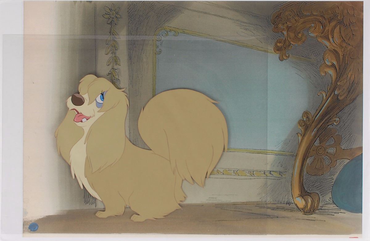 (Walt Disney Studios, 1955) Original production cel featuring Peg from Lady and the Tramp, showing the Pekingese sitting on a dining room floor. The cel is placed on a color copy background. Image measures 8 x 6.5, with overall dimensions of 17 x 11. In fine condition, with trivial soiling and impressions, none affecting the image.