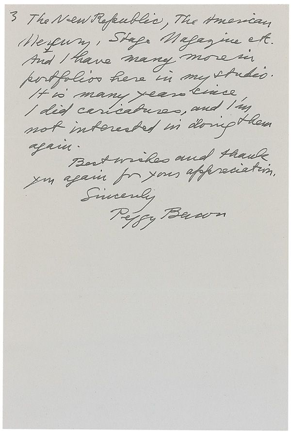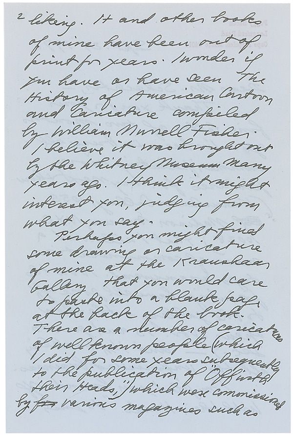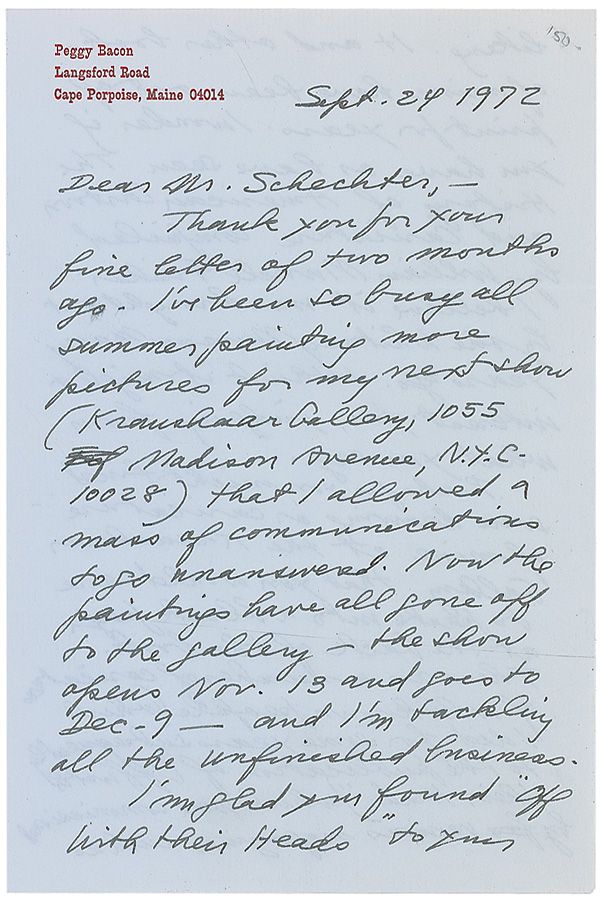 ALS, three pages of two sheets, 6 x 9, personal letterhead, September 24, 1972. Letter to an admirer. In part: “I've been so busy all summer painting more pictures for my next show…that l allowed a mass of communications to go unanswered. Now the paintings have all gone off to the gallery-the show opens Nov. 13 and goes to Dec. 9-and l'm tackling all the unfinished business. l'm glad you found ‘Off With Their Heads’ to your liking. lt and other books of mine have been out of print for years.” In fine condition, with small pencil notation to top of first page.