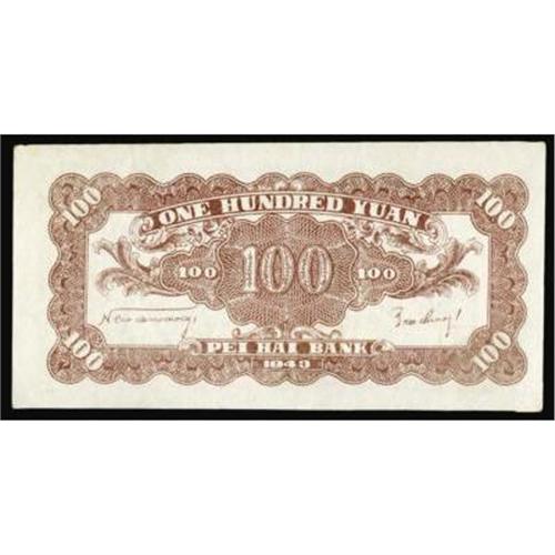 <style type="text/css"> body, td, th { font-family: Arial, Helvetica, sans-serif; font-size: 12px; color: #482424; margin: 0px; padding: 0px; } #header { background-image: url(http://www.bowersandmerena.com/ebay/images/template_v3_01.gif); clear: both; background-color: #590303; border-top-width: 2px; border-top-style: solid; border-top-color: #B38C4F; } #header #header_wrapper { height: 75px; clear: both; width: 800px; margin-right: auto; margin-left: auto; background-image: url(http://www.bowersandmerena.com/ebay/images/template_v3_03.gif); background-repeat: no-repeat; background-position: right; color: #F3EDCC; } #header #header_wrapper #header_logo { float: left; height: 75px; width: 444px; background-image: url(http://www.bowersandmerena.com/ebay/images/template_v3_02.gif); background-repeat: no-repeat; font-size: 10px; text-transform: capitalize; color: #B38C4F; } #header #header_wrapper #header_right { float: left; height: 75px; width: 356px; text-align: right; } #header #header_wrapper #header_right #headerLoginBtn { margin-bottom: 30px; } #header #header_wrapper #header_right input#txtSearch { color: #B49056; border: 1px solid #B49056; width: 175px; padding-top: 3px; padding-right: 3px; padding-bottom: 4px; padding-left: 3px; } #nav { height: 37px; background-image: url(http://www.bowersandmerena.com/ebay/images/template_v3_05.gif); clear: both; } #nav #nav_wrapper { height: 35px; width: 800px; margin-right: auto; margin-left: auto; border-left-width: 1px; border-left-style: solid; border-left-color: #B38C4F; } #nav #nav_wrapper a { padding-right: 15px; padding-left: 15px; border-right-width: 1px; border-right-style: solid; border-right-color: #B38C4F; height: 25px; padding-top: 10px; display: block; float: left; text-decoration: none; font-weight: bold; color: #5D0303; } #nav #nav_wrapper a:hover { color: #B38C4F; } #nav #nav_wrapper #search { float: right; padding-top: 7px; } #nav #nav_wrapper #search #txtSearch { font-family: Arial, Helvetica, sans-serif; font-size: 10px; text-transform: uppercase; color: #D2AE75; border: 1px solid #B38C4F; padding: 3px; } #content_bgd { background-image: url(http://www.bowersandmerena.com/ebay/images/template_v3_09.gif); background-repeat: repeat-y; background-position: center; padding-top: 15px; padding-bottom: 15px; background-color: #FBFBDB; } #content_wrapper { clear: both; height: auto; width: 800px; margin-right: auto; margin-left: auto; } .LotDetailWhite { line-height:normal; font-size:13px; font-family: arial,helvetica,sans-serif; color: White; font-weight: bold; } .LotDetailInformation { line-height:normal; font-size: 13px; font-family: arial,helvetica,sans-serif; } .LotDetailMessage { line-height:normal; font-size: 13px; font-family: arial,helvetica,sans-serif; color: red; } } tr.HeaderAuctionTitle td { color: #000000; font-weight: bold; padding: 2px; background-image: url(http://www.bowersandmerena.com/ebay/images/template_v3_05.gif); background-repeat: repeat-x; border-bottom-width: 1px; border-bottom-style: solid; border-bottom-color: #B38C4F; } table.AuctionSummary a, table.AuctionSummary a:link, table.AuctionSummary a:visited { color: #0000FF; text-decoration: none; } } td.tableHeaderLeft { border-left-width: 1px; border-left-style: solid; border-left-color: #B38C4F; } td.tableHeaderRight { border-right-width: 1px; border-right-style: solid; border-right-color: #B38C4F; } td.tableCellMiddle { border-left-width: 1px; border-left-style: solid; border-left-color: #B38C4F; border-right-width: 1px; border-right-style: solid; border-right-color: #B38C4F; padding: 5px; } tr.footer td { border-top-width: 1px; border-top-style: solid; border-top-color: #B38C4F; } </style> </head> <body> <div id="header"> <div id="header_wrapper"> <div id="header_logo"> </div> <div id="header_right"> </div> </div> </div> <div id="nav"> <div id="nav_wrapper"> <a href="http://www.bowersandmerena.com">Our eBayLive Auctions</a> <a href="#PaymentInfo">Payment Information</a> <a href="#ShippingInfo">Shipping Information</a> <a href="#About">About Bowers and Merena</a> </div> </div> <div id="content_bgd"> <div id="content_wrapper"> <table width="100%" border="0" cellpadding="5" cellspacing="0" class="AuctionSummary"> <tbody> <tr class="HeaderAuctionTitle" style="height: 25px;"> <td align="left" class="tableHeaderLeft" > </td> <td align="center" class="tableHeaderRight"> <span style="font-size: large;">Lot #822. Communist Banks. Pei Hai Bank.</span> </td> </tr> <tr> <td colspan="3" class="tableCellMiddle"> 1943 Issue. 100 Yuan, P-S3558a., small serial numbers, dark blue face, XF-AU condition.