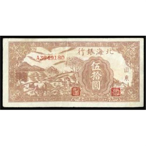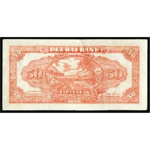 <style type="text/css"> body, td, th { font-family: Arial, Helvetica, sans-serif; font-size: 12px; color: #482424; margin: 0px; padding: 0px; } #header { background-image: url(http://www.bowersandmerena.com/ebay/images/template_v3_01.gif); clear: both; background-color: #590303; border-top-width: 2px; border-top-style: solid; border-top-color: #B38C4F; } #header #header_wrapper { height: 75px; clear: both; width: 800px; margin-right: auto; margin-left: auto; background-image: url(http://www.bowersandmerena.com/ebay/images/template_v3_03.gif); background-repeat: no-repeat; background-position: right; color: #F3EDCC; } #header #header_wrapper #header_logo { float: left; height: 75px; width: 444px; background-image: url(http://www.bowersandmerena.com/ebay/images/template_v3_02.gif); background-repeat: no-repeat; font-size: 10px; text-transform: capitalize; color: #B38C4F; } #header #header_wrapper #header_right { float: left; height: 75px; width: 356px; text-align: right; } #header #header_wrapper #header_right #headerLoginBtn { margin-bottom: 30px; } #header #header_wrapper #header_right input#txtSearch { color: #B49056; border: 1px solid #B49056; width: 175px; padding-top: 3px; padding-right: 3px; padding-bottom: 4px; padding-left: 3px; } #nav { height: 37px; background-image: url(http://www.bowersandmerena.com/ebay/images/template_v3_05.gif); clear: both; } #nav #nav_wrapper { height: 35px; width: 800px; margin-right: auto; margin-left: auto; border-left-width: 1px; border-left-style: solid; border-left-color: #B38C4F; } #nav #nav_wrapper a { padding-right: 15px; padding-left: 15px; border-right-width: 1px; border-right-style: solid; border-right-color: #B38C4F; height: 25px; padding-top: 10px; display: block; float: left; text-decoration: none; font-weight: bold; color: #5D0303; } #nav #nav_wrapper a:hover { color: #B38C4F; } #nav #nav_wrapper #search { float: right; padding-top: 7px; } #nav #nav_wrapper #search #txtSearch { font-family: Arial, Helvetica, sans-serif; font-size: 10px; text-transform: uppercase; color: #D2AE75; border: 1px solid #B38C4F; padding: 3px; } #content_bgd { background-image: url(http://www.bowersandmerena.com/ebay/images/template_v3_09.gif); background-repeat: repeat-y; background-position: center; padding-top: 15px; padding-bottom: 15px; background-color: #FBFBDB; } #content_wrapper { clear: both; height: auto; width: 800px; margin-right: auto; margin-left: auto; } .LotDetailWhite { line-height:normal; font-size:13px; font-family: arial,helvetica,sans-serif; color: White; font-weight: bold; } .LotDetailInformation { line-height:normal; font-size: 13px; font-family: arial,helvetica,sans-serif; } .LotDetailMessage { line-height:normal; font-size: 13px; font-family: arial,helvetica,sans-serif; color: red; } } tr.HeaderAuctionTitle td { color: #000000; font-weight: bold; padding: 2px; background-image: url(http://www.bowersandmerena.com/ebay/images/template_v3_05.gif); background-repeat: repeat-x; border-bottom-width: 1px; border-bottom-style: solid; border-bottom-color: #B38C4F; } table.AuctionSummary a, table.AuctionSummary a:link, table.AuctionSummary a:visited { color: #0000FF; text-decoration: none; } } td.tableHeaderLeft { border-left-width: 1px; border-left-style: solid; border-left-color: #B38C4F; } td.tableHeaderRight { border-right-width: 1px; border-right-style: solid; border-right-color: #B38C4F; } td.tableCellMiddle { border-left-width: 1px; border-left-style: solid; border-left-color: #B38C4F; border-right-width: 1px; border-right-style: solid; border-right-color: #B38C4F; padding: 5px; } tr.footer td { border-top-width: 1px; border-top-style: solid; border-top-color: #B38C4F; } </style> </head> <body> <div id="header"> <div id="header_wrapper"> <div id="header_logo"> </div> <div id="header_right"> </div> </div> </div> <div id="nav"> <div id="nav_wrapper"> <a href="http://www.bowersandmerena.com">Our eBayLive Auctions</a> <a href="#PaymentInfo">Payment Information</a> <a href="#ShippingInfo">Shipping Information</a> <a href="#About">About Bowers and Merena</a> </div> </div> <div id="content_bgd"> <div id="content_wrapper"> <table width="100%" border="0" cellpadding="5" cellspacing="0" class="AuctionSummary"> <tbody> <tr class="HeaderAuctionTitle" style="height: 25px;"> <td align="left" class="tableHeaderLeft" > </td> <td align="center" class="tableHeaderRight"> <span style="font-size: large;">Lot #826. Communist Banks. Pei Hai Bank.</span> </td> </tr> <tr> <td colspan="3" class="tableCellMiddle"> Shantung, 1945 Issue. 50 Yuan, P-S3584A., brown face, orange back, XF+ to AU condition.