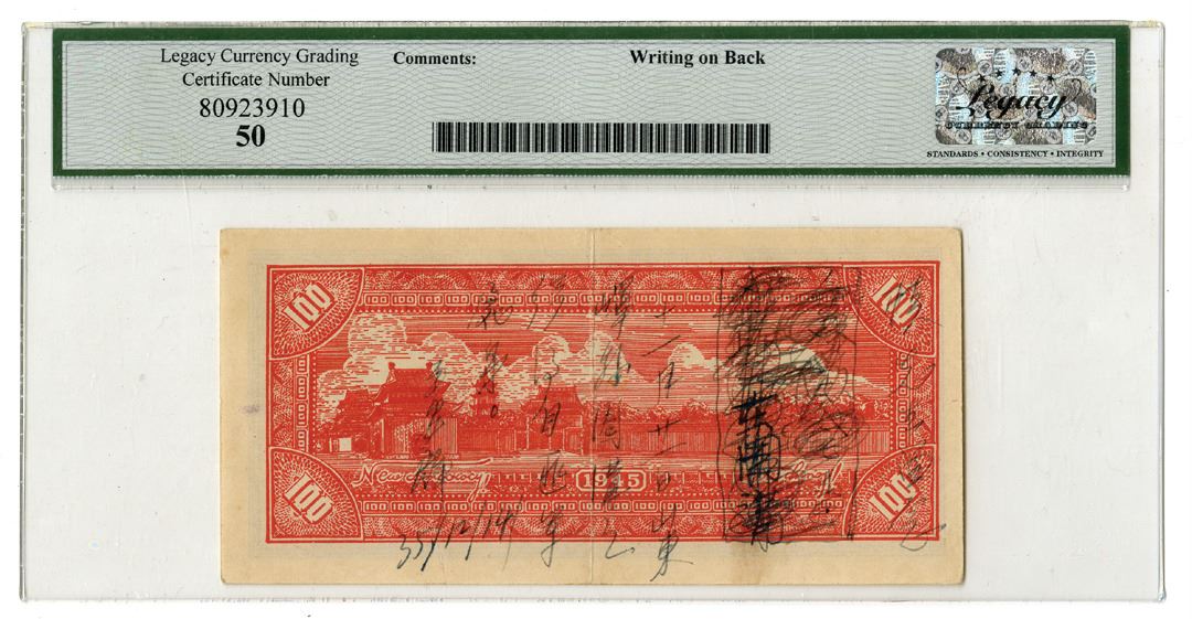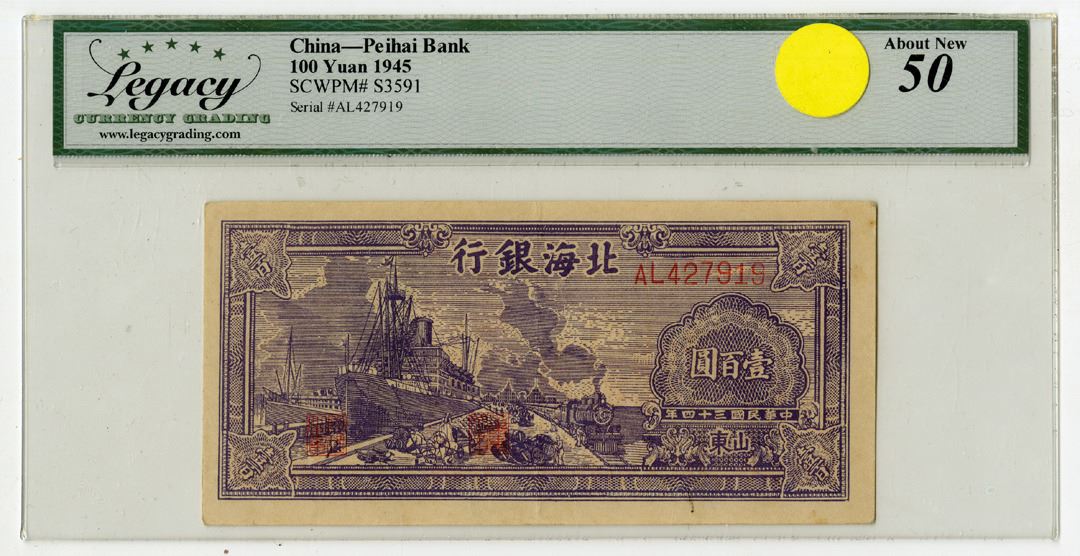 China, 1945, 100 Yuan, P-S3591, Purple obverse with steamship at dock and locomotive, back red with considerable graffiti, S/N AL 427919, Legacy graded About New 50. Only 4 examples have been graded in the PMG census previously, with this example making 5 notes total graded. This example is close to the highest graded example in the PMG census out of the 5 notes. No examples from any source have appeared at auction previously. This is a rare if not unique opportunity to capture this outstanding note.