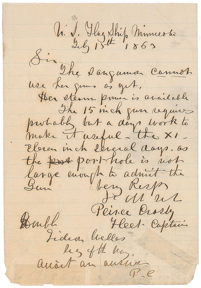 Rear admiral in the US Navy (1824–1899) who helped enforce the blockade of the Confederacy's east coast. Civil War–dated ALS signed “Pierce Crosby, Fleet Captain,” one page, lightly-lined, 5 x 7.25, February 15, 1863. Letter to Secretary of the Navy Gideon Welles. In full: “The Sangamon cannot use her guns as yet. Her steam power is available. The 15 inch gun requires probably but a days work to make it useful—the XI—Eleven inch several days, as the porthole is not large enough to admit the gun.” In very good condition, with some chipping to bottom edge and show-through at the bottom from small tape-repaired tears.