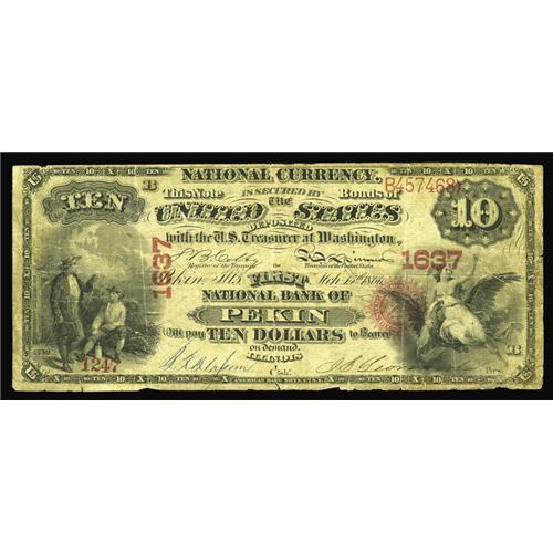 <B>Pekin, IL</B></I> - $10 Original Fr. 412 <B>The First NB</B></I> Ch. # 1637<BR>This note previously appeared in our FUN 2003 Signature Sale as one of the most significant notes in Walter T. Herget's Collection of Illinois Nationals. Here is the original description, "Pekin was Walter Herget's home town, and notes from this city, Tazewell County, and neighboring Peoria County were Mr. Herget's first love. The Pekin and Peoria notes offered below are an extraordinary testament to what one determined collector armed with unbounded enthusiasm and considerable financial resources was able to amass over a twenty five year period stretching from 1967 to 1992. The note we offer here is from a bank which issued First Charters only before its demise in 1875. Only one example is known, and this is it. Our records indicate that this is the first opportunity that collectors have ever had to obtain an example from here, as our data shows no public offerings whatever from this short lived bank during the past sixty years. Notes of this rarity are hard to evaluate in today's considerably more sophisticated market, but our guess is that this pleasing <B>Fine</B></I> example may well surprise before the hammer falls this evening." A second note from here has now been reported, but this piece will still easily reach or exceed...