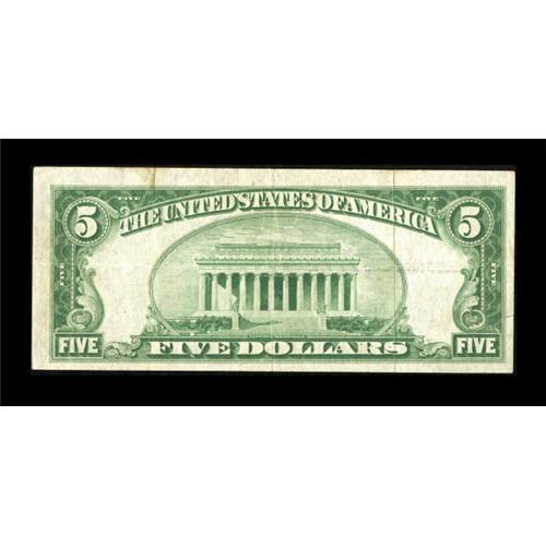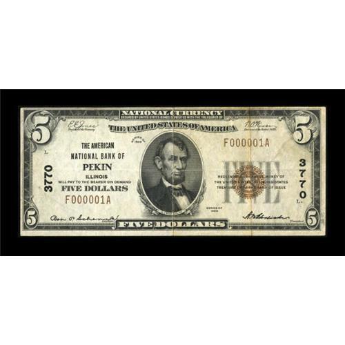 <B>Pekin, IL</B></I> - $5 1929 Ty. 1 <B>The American NB</B></I> Ch. # 3770<BR> Several other serial number one $5 survivors are known from this institution, but this marks the only small size example reported. A hard center fold and a quarter inch tear in the lower left margin are the only issues noticed on an otherwise bright note. <B>Very Fine</B></I>.<BR><BR><b>Shipping:</b> Coins & Currency (<a target="_blank" href="http://www.heritageauctions.com/common/shipping.php">view shipping information</a>)