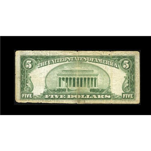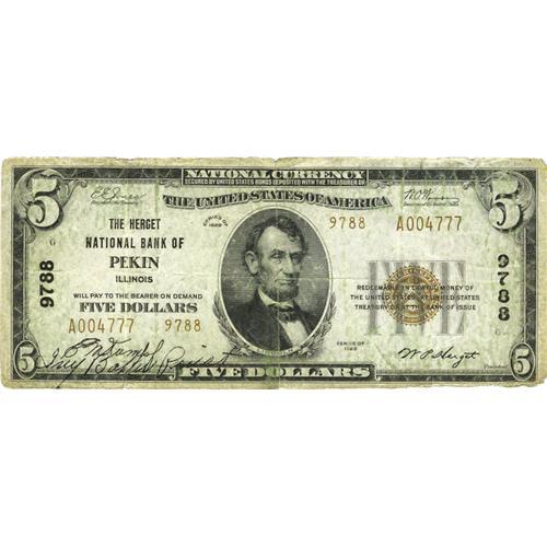 <B>Pekin, IL</B></I> - $5 1929 Ty. 2 <B>The Herget NB</B></I> Ch. # 9788<BR>This small community not far from Peoria takes its name from that of Peking, China. The local high school athletic teams were for many years affectionately know as the "Chinks" until such aberrant behavior was with zealous and unrelenting righteousness subjected to condemnation and disdain, resulting in a transition to the less offensive "Dragons," circa 1981. While we have been unable to verify what may be an unsubstantiated rumor, unnamed sources claim that at a cleverly concealed local shirt shop, the location of which is a jealously guarded secret known to only a tiny handful of select initiates, it may still be possible to acquire a t-shirt with the suppressed logo and title. The otherwise <B>Fine</B></I> example we offer tonight is from the decidedly less available $5 type 2 design. We mention for the sake of accuracy scattered margin roughness and a couple of minor edge splits. Without those we'd have considered this note a full Very Fine. Wait, there's more! A courtesy autograph of Eisenhower era Treasurer of the United States Ivy Baker Priest appears at lower left.