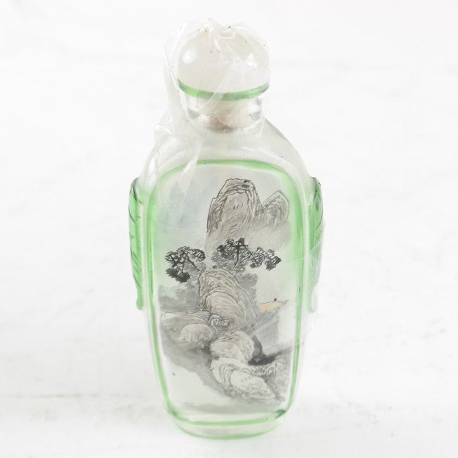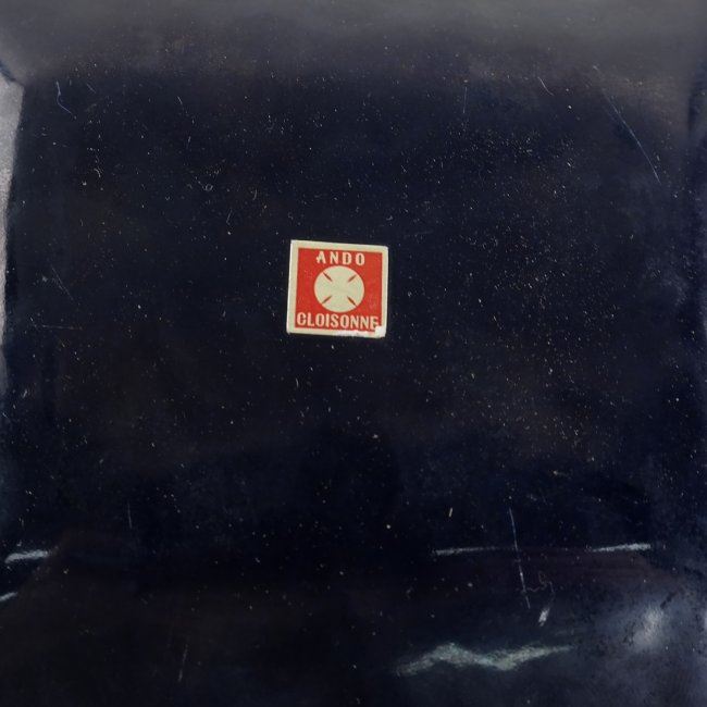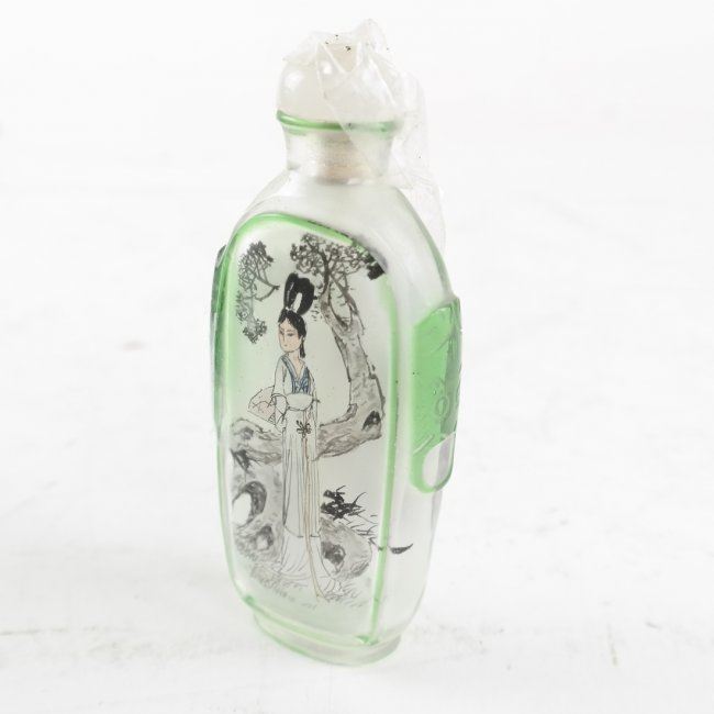 Comprises: 1.) Peking glass snuff bottle with inner paint decor both sides. [3 1/2" H x 1 1/2" W]. 2.) "Ando Cloisonne" small tray. [4" H x 5" W]. In good condition, surface grime.