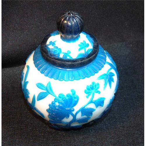 Peking art glass container decorated with floral design blue on milky white background. Size: 12.5 x 11.5 cm. Estimated value: $700.