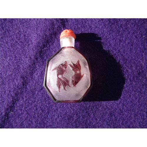 Peking glass snuff bottle with two fish swimming in the opposite directions design in the center carved in cranberry outlay glass. The reverse features 2 birds flying together. The rebus is that a happy marriage union may dissolute in a divorce. The inner layer is made of slightly opaque glass with incised design. A red steatite carved stopper stopper complements this snuff bottle. Estimated value: $400.