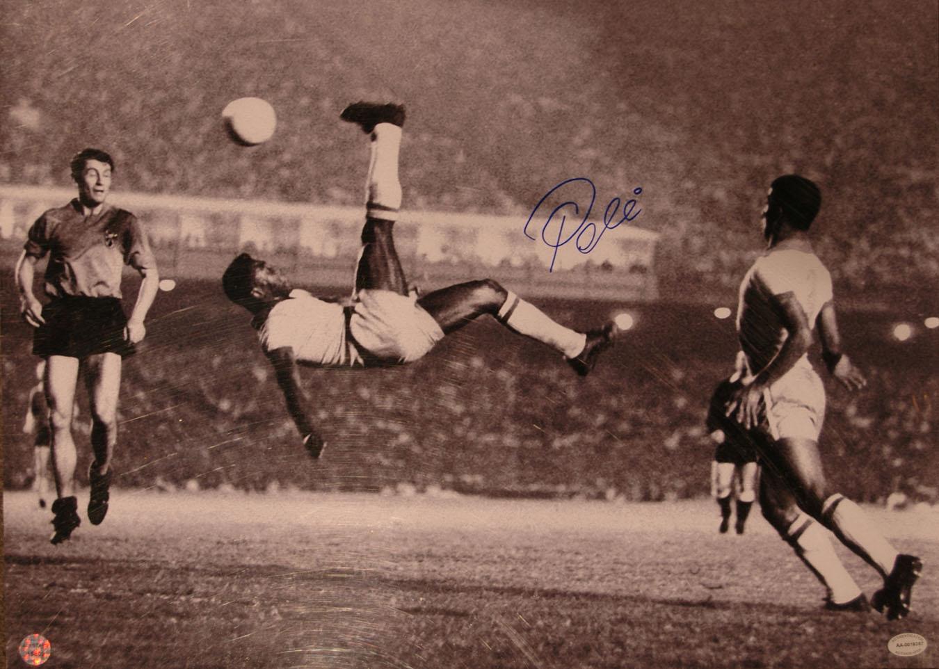 Rare Pele signed photo from his infamous ''Bicycle Kick'' on 2 June 1965 during the Brazil vs. Belgium game. Lot accompanied by Letters of Authenticity from A.S. and A.A. Image measures 18'' x 24''. Overall excellent condition.