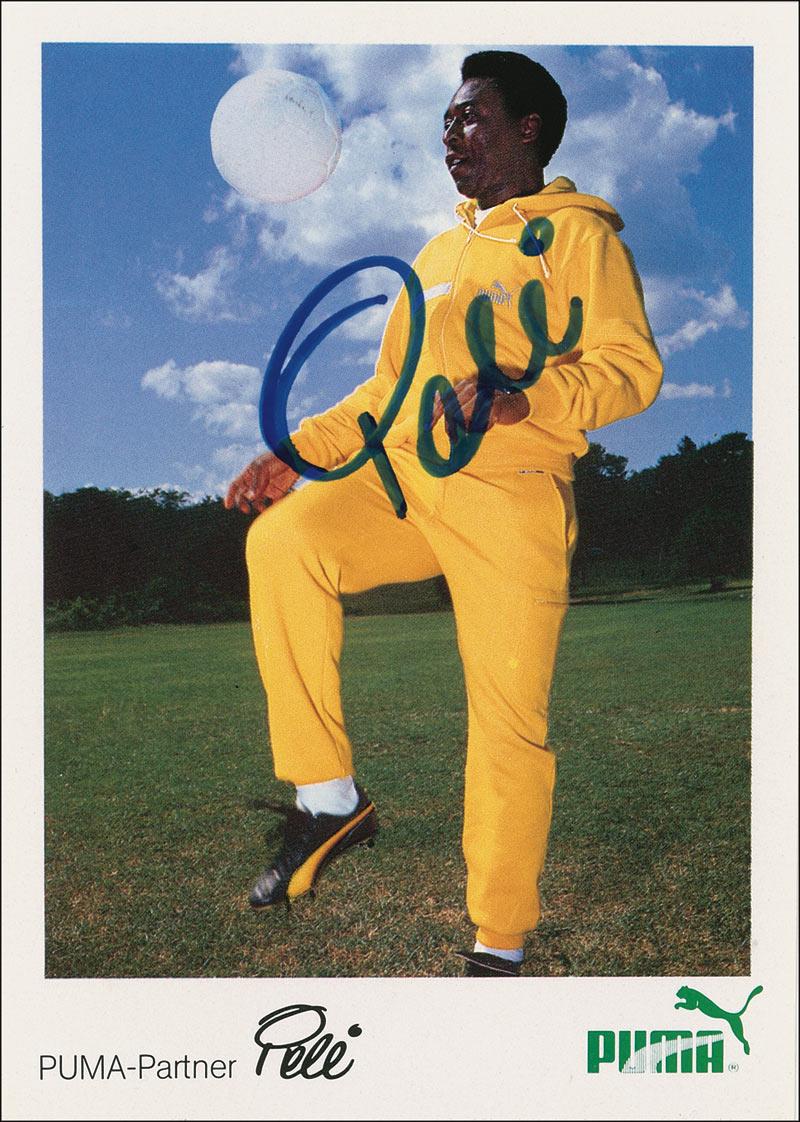 Two matching color 4.25 x 5.75 Puma promotional photos, one signed in blue felt tip by Pelé, and one signed in black felt tip by Maradona. In fine condition.